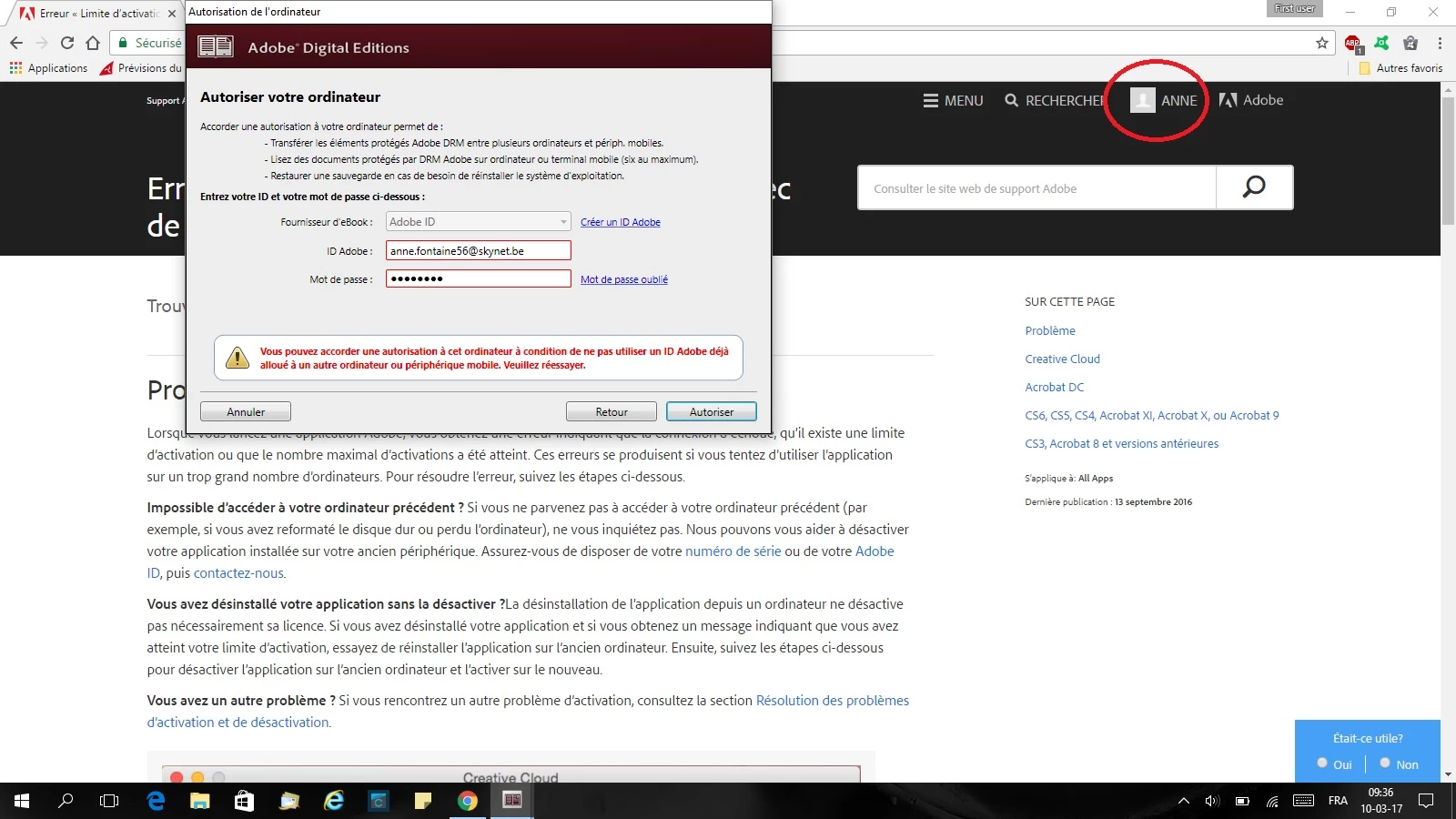 I can't change the authorization of my PC because it seems that the account is already linked to another computer (see file) but i don't know which one. I checked on my old PC but ADE isn't installed on it.