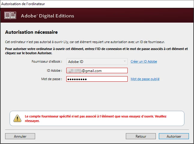 Lorsque j'encode l'ID ADobe et le Mot de passe passe, j'ai un message d'erreur : Le compte fournisseur spécifié n'est pas associé à l'élément que vous essayez d'ouvrir. Veuillez réessayer.