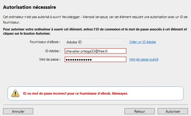 Ce matin l'assistance du site a nettoyé, vérifié mon compte et me voici à nouveau avec les bons ID et mot de passe avec le message d'erreur :