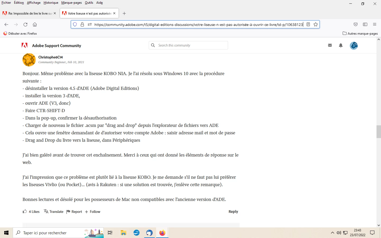 Pourtant ma liseuse est correctement autorisée dans ADE. Avec le meme ID adobe sur le PC (Windows 10) et sur la liseuse. Le livre apparait bien sur la liseuse mais impossible de l'ouvrir.