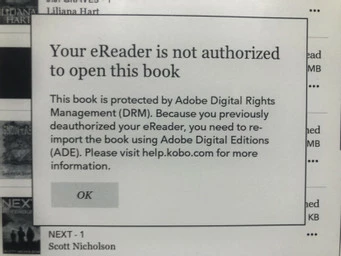 I have a Kobo H2o. I have dowloaded many books from my pubic library using Adobe Digital Editions. Now, when I try to open a dowloaded book, I get "Your eReader is not authorized to open this book". When I check my "Accounts" settings, it confirms that my Kobo is authorized with Adobe. I have "deauthorized" my account many times and "Authorized" it again, I have even deauthorized my computer and erased Adobe and reloaded it again. I have done a factory reset 3 times and even tried a different computer. Can anyone help me figure this out please?