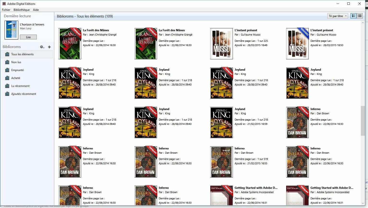Ma bibliothèque affiche les e-books téléchargés en plusieurs exemplaires (voir image jointe).