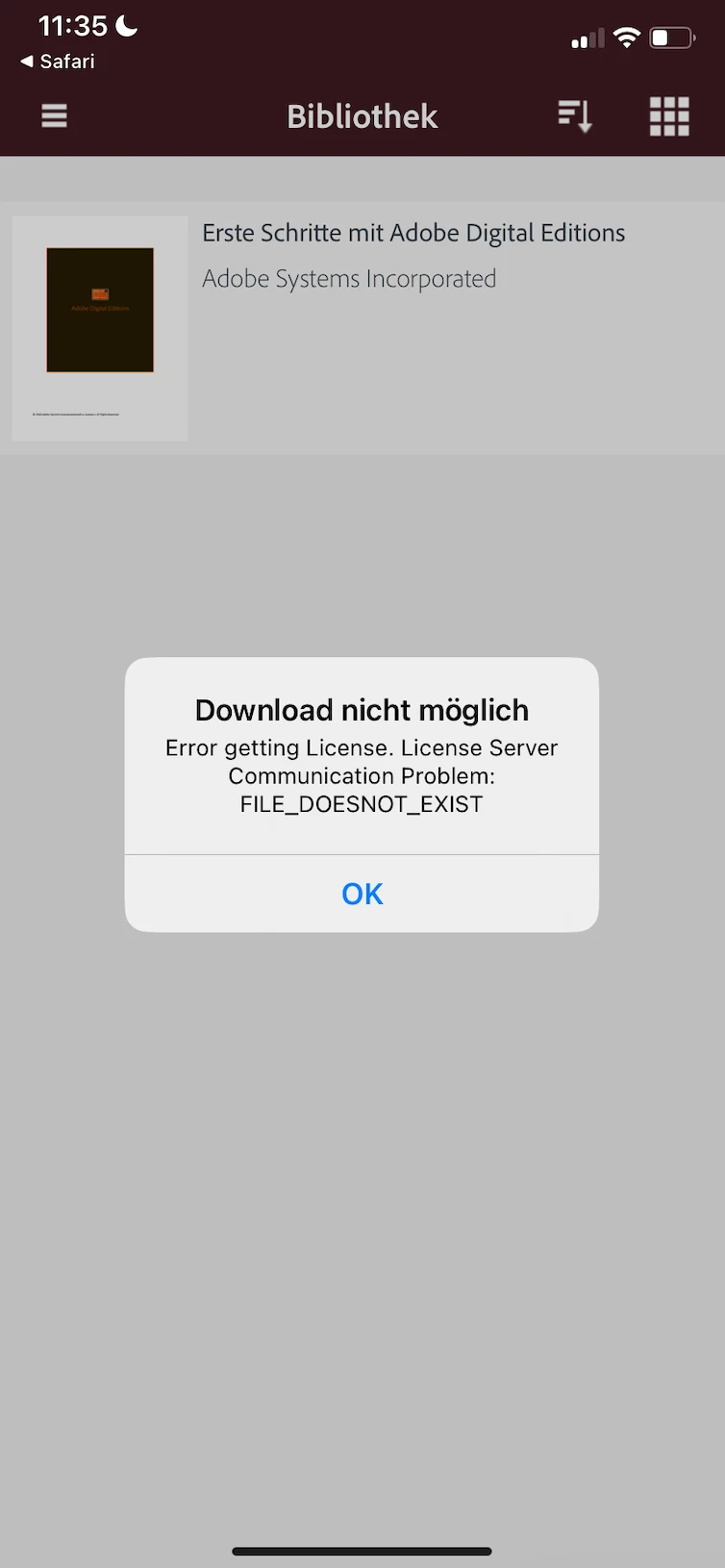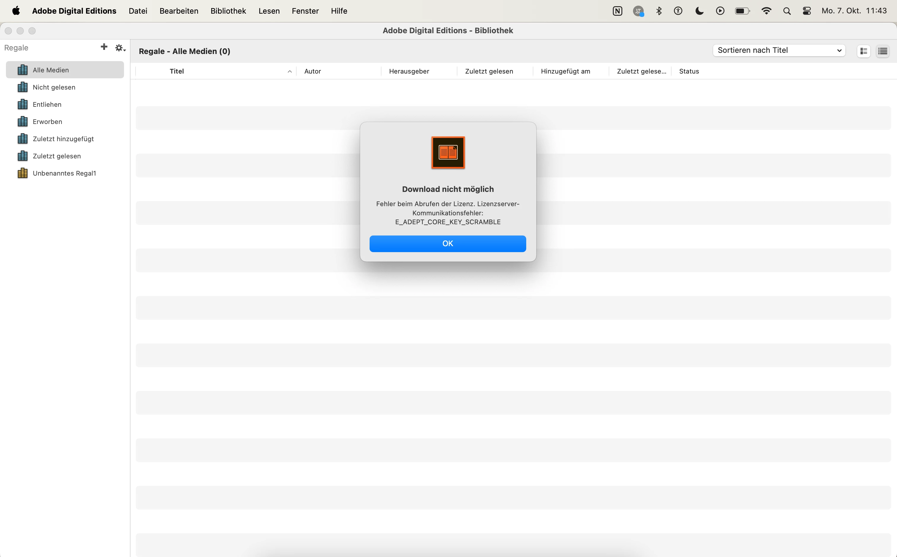 ich habe ein Buch über Google Play gekauft (nicht geliehen). Wenn ich die epub.acsm Datei es über Adobe Digital Editions öffne, erscheint die Fehlermeldung: Download nicht möglich. Fehler beim Abrufen der Lizenz. Lizenzserver-Kommunikationsfehler: E_ADEPT_CORE_KEY_SCRAMBLE. Der Google Support hat mir bestätigt, dass es nicht an der Datei liegt, ich solle mich an Adobe wenden.