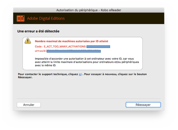 Lorsque je veux autoriser ma liseuse Kobo avec Adobe digital édition, on me met le message d'erreur suivant : E_ACT_TOO_MANY_ACTIVATIONS.