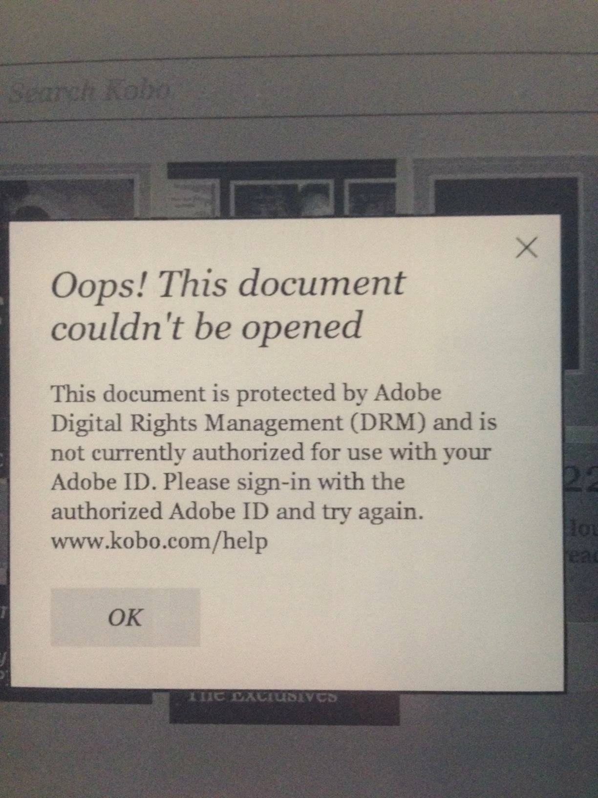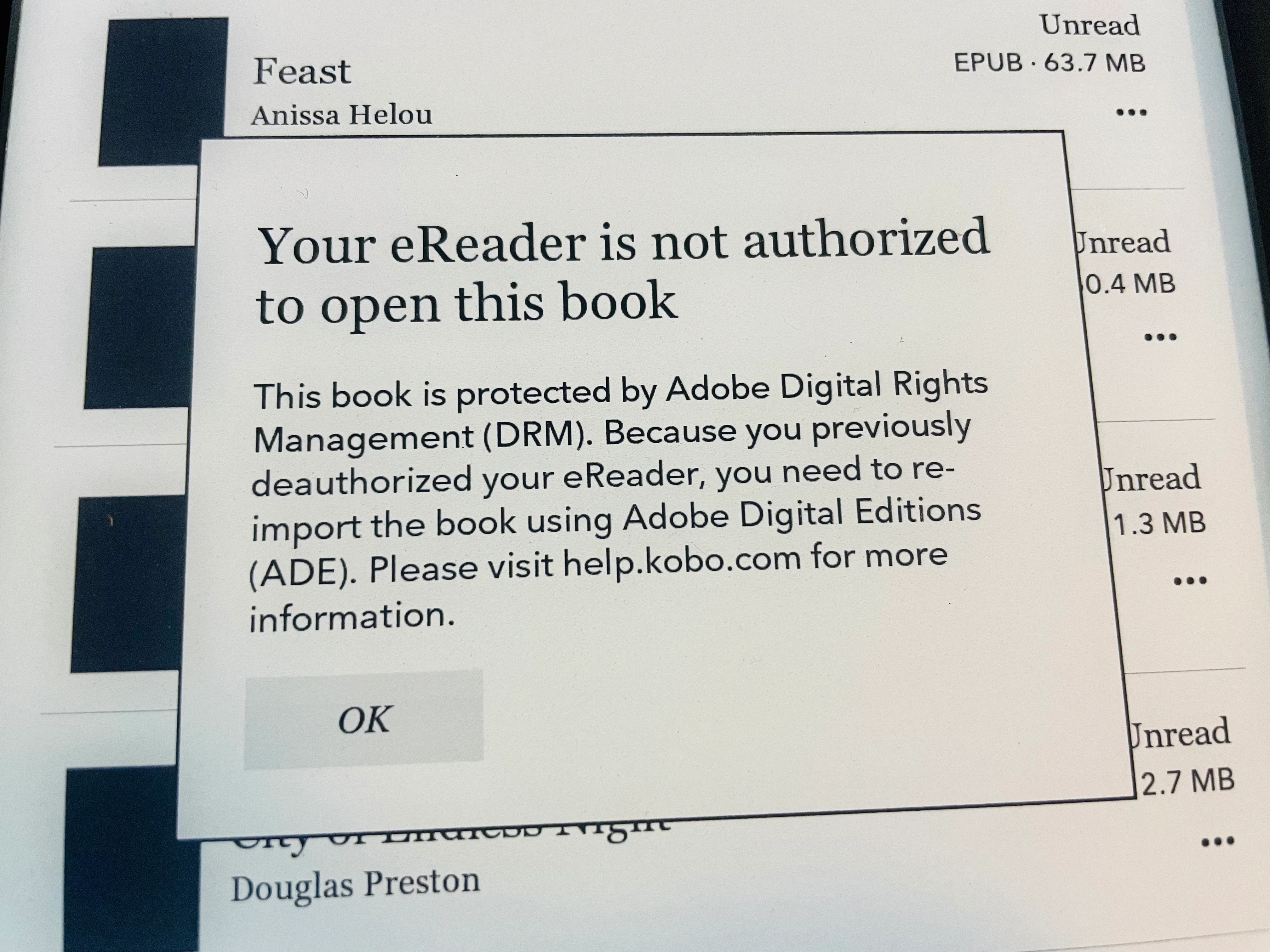 Whenever I try to open a book from Overdrive on my Kobo Aura H2O, it says I'm not authorized. It was working a few weeks ago, and I can read them on my Mac with the same ID. I've tried un-authorizingg and re-authorizing on both my Mac and my Kobo. It doesn't work. t'm using version 4.5.