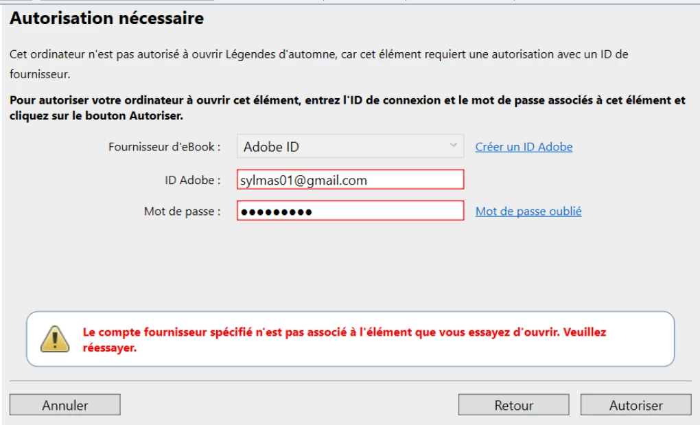 Most of my epub files have been bought and downloaded with an Adobe ID '( = my email address) , that I have apparently lost.