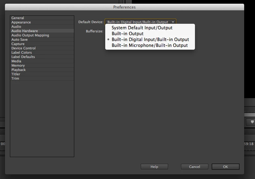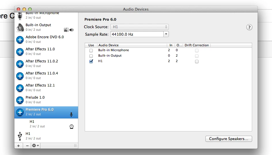 Upgraded the Firmware for my Zoom h1 to v2.10. Selected the H1 in the audio midi setup for Premiere. I get these selections in the preferences> audio hardware. Tried all of the settings. Also, selected the "monitor input only".