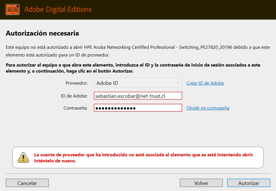 I bought an eBook from HPE and installed Adobe Digital Edition in November 2024. Unfortunately my laptop was stolen, and now that I have installed the application again, it does not allow me to open the file, and I have no way to open a ticket in Adobe. What can I do? Image attached