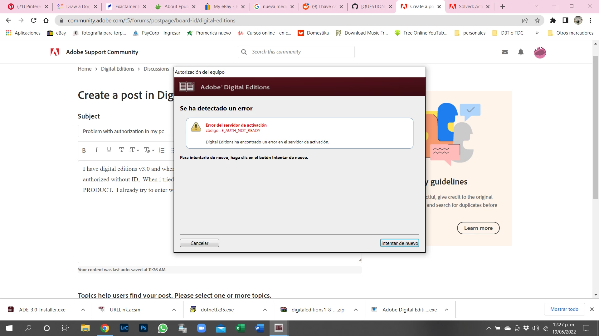 I have digital editions v3.0 and when i try to authorize it it appears this message: This equipment is authorized without ID, When i tried to downoald a .ASCM file it appears ERROR ACTIVATION PRODUCT. I already try to enter with my Adobe ID but it appears this message:
