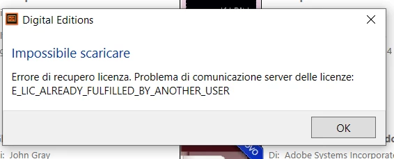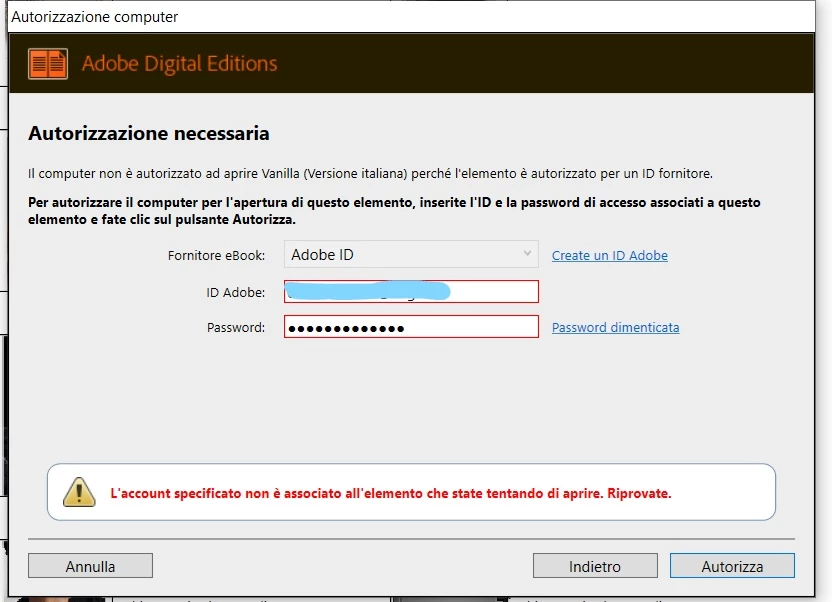 buongiorno , non riesco più ad aprire alcuni Ebook acquistati da La feltrinelli e presenti sulla biblioteca kobo. non riconosce più il mio codice ID Adobe e la pass abbinata . ho provato a togliere l'autorizzazione su ADE ma non cambia nulla , così a rimetterne una nuova .queste sono le finestre che si aprono . qualcuno sa come risolvere il problema ???