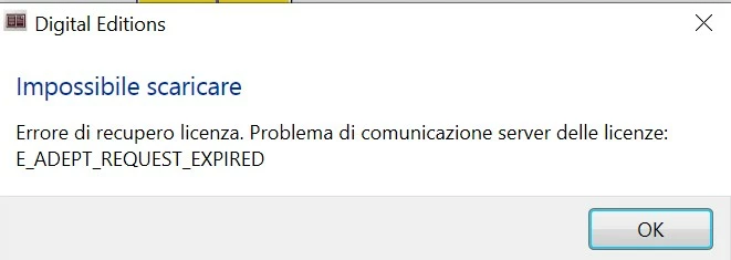 When I try to upload the ebook into Adobe Digital Editions 3.0 this happens: "problems with the licence: E_ADEPT_REQUEST_EXPIRED" (I've attached the screenshot even tough it's in Italian).