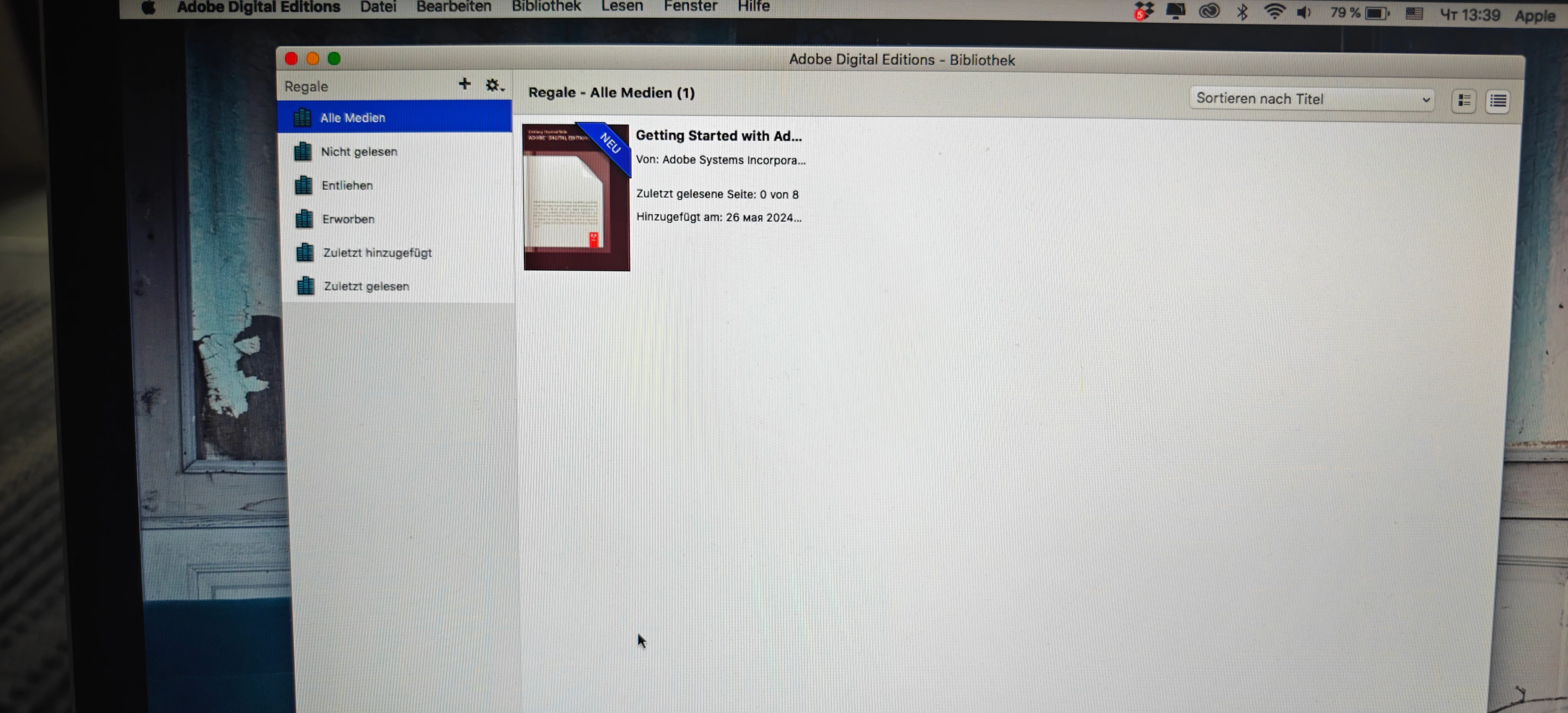 Hello! I bought a book on Google Books, downloaded it to my Mac, and now I want to transfer it to my wife's Pocketbook. I installed the latest version of Adobe Digital Editions, but when I try to load the book for conversion, the program throws an error. I registered with my Adobe account, but I suspect that since Google is the book provider, I should log in with the Google account I used to purchase the book. However, I can't log into my Google account in ADE—it keeps saying the password is incorrect, even though I'm entering it correctly. As a result, I can't do anything. The ADE program itself also looks strange. I'm attaching screenshots. I have already contacted support but have not yet received a clear positive response to solve the problem. I still don't understand how to change the language in the ADE program. The program itself looks odd; there are no "File" or other tabs. I'm not sure if this is relevant, but I'll mention it.