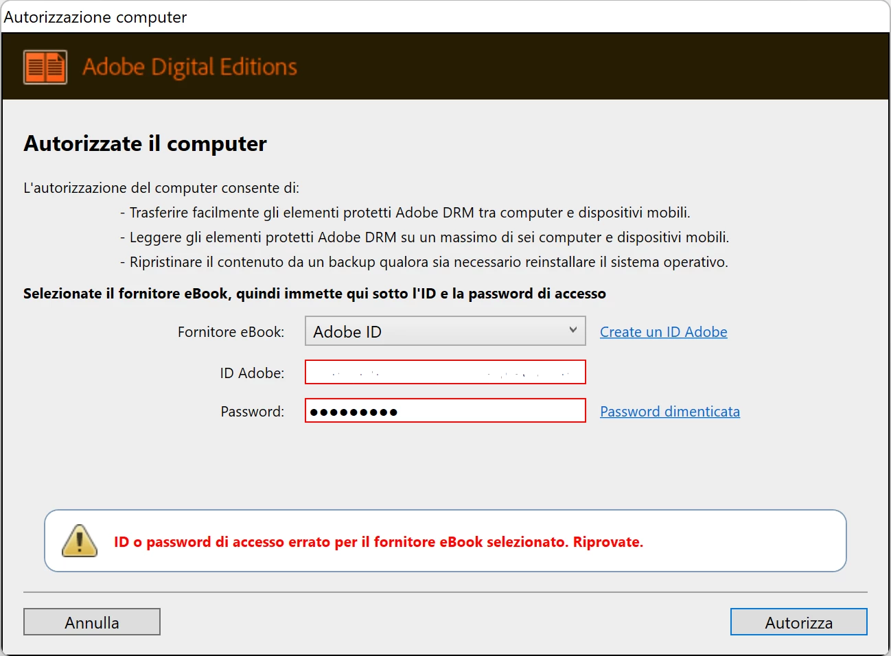 I'm now trying to authorize an app on Windows and when I enter the credentials I get an "incorrect login password for the selected ebook" error.