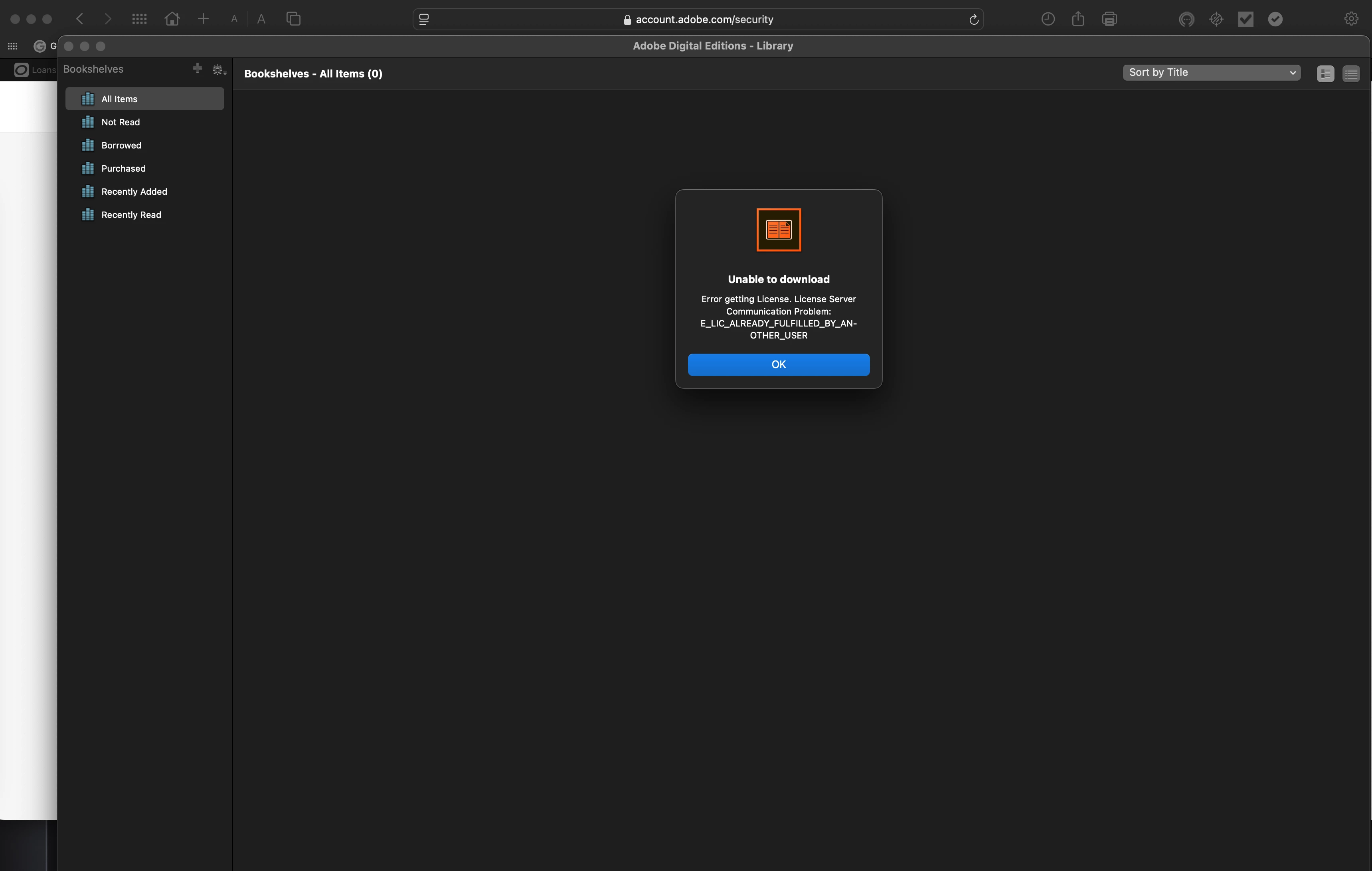 After installing the Digital Editions Download app (MacOS), I encounter a pop-up error message that simply says "Unable to Download"