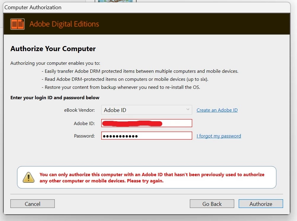 Isn't this quite contradictory? I mean, if I need to transfer DRM protected items across devices, I will have to setup each device on the same Adobe ID, if am not wrong. But it is asking me to authorise my computer using a new Adobe ID? I really do not know what is going on.