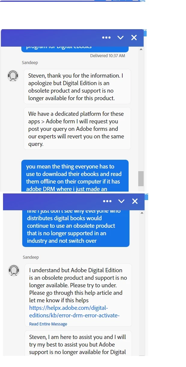 Also I want to note that when contacting tech support they told me ADE is an obsolete product and support is no longer provided, which, seems ridiciulous if it is still actively being used in the digital book industry. I have provided stitched together screenshots showing this.