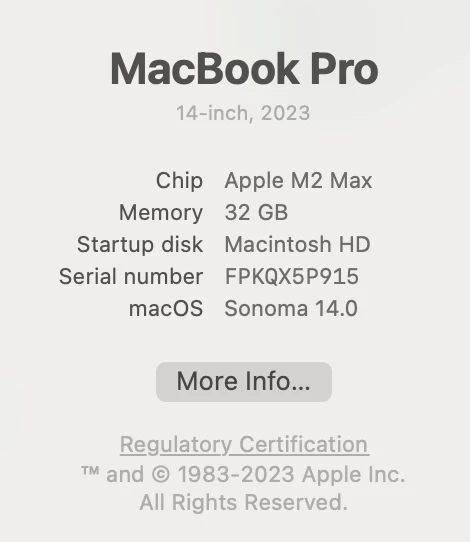 My machine is a 2023 M2 MacBook Pro, 32gb memory.