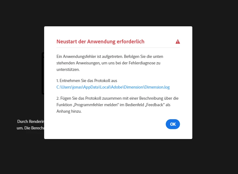 Guten Tag. Ich hoffe mir kann jemand weiterhelfen... Seit geraumer Zeit habe ich das Problem das ich jedes mal nach dem Rendern eines Bildes diese Fehlermeldung bekomme. Ich weiss nicht ob es an Windows 11 liegt oder ob das andere Gründe hat. Ich würde mich über jede Hilfe sehr freuen ,da ich Adobe Dimension geschäftlich benutze und dies derzeit ein großes Problem darstellt.