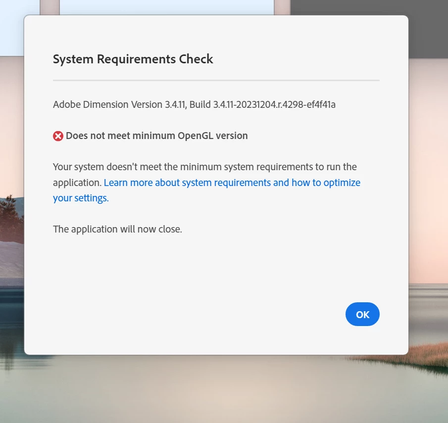 Hi, I keep on getting the attached error when opening Adobe Dimensions, and I believe I do have the correct system requirements. Any ideas why I am getting this error, or what I can do to resolve?