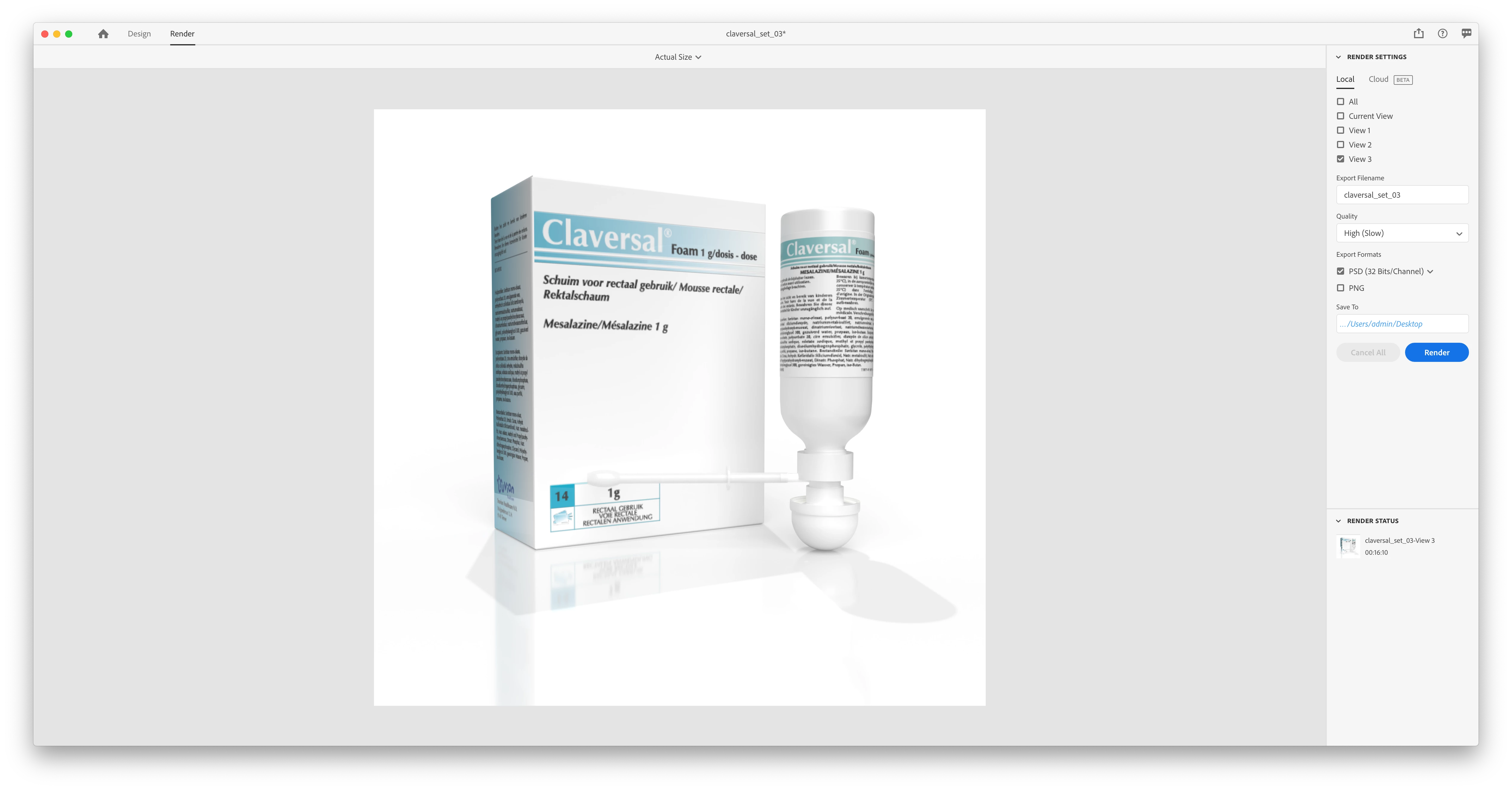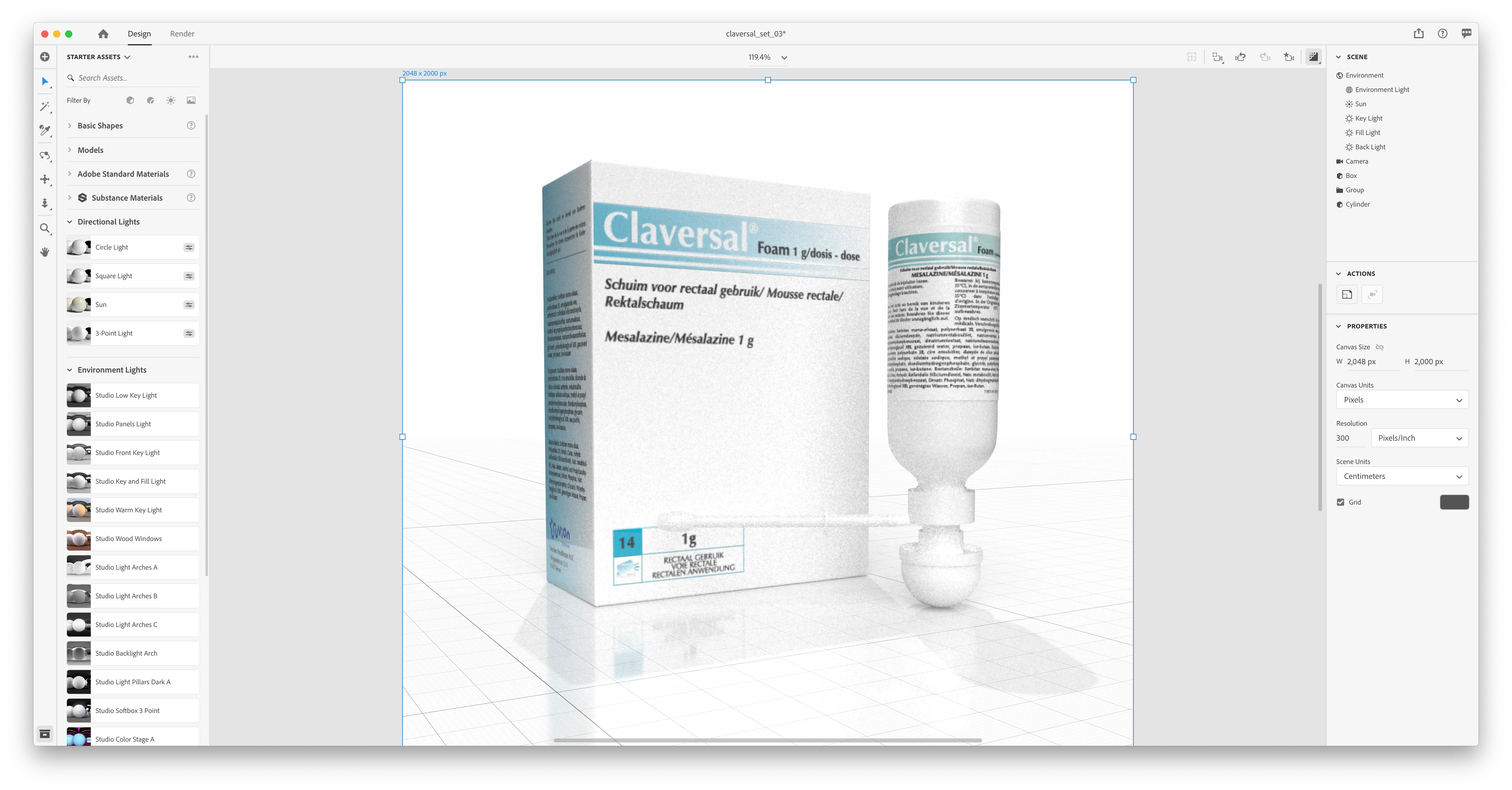 I am using Dimensions to create a realist photograph of a branded box using a packaging template I have created in Illustrator.