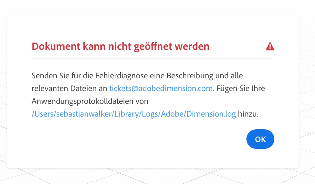 1 sorry for my high school german but i read that as "send a description and all relevant files for error diagnosis" which I'm afraid is marketing talk, Adobe Dimension has finished and even before they didn't give much effort into reading logs