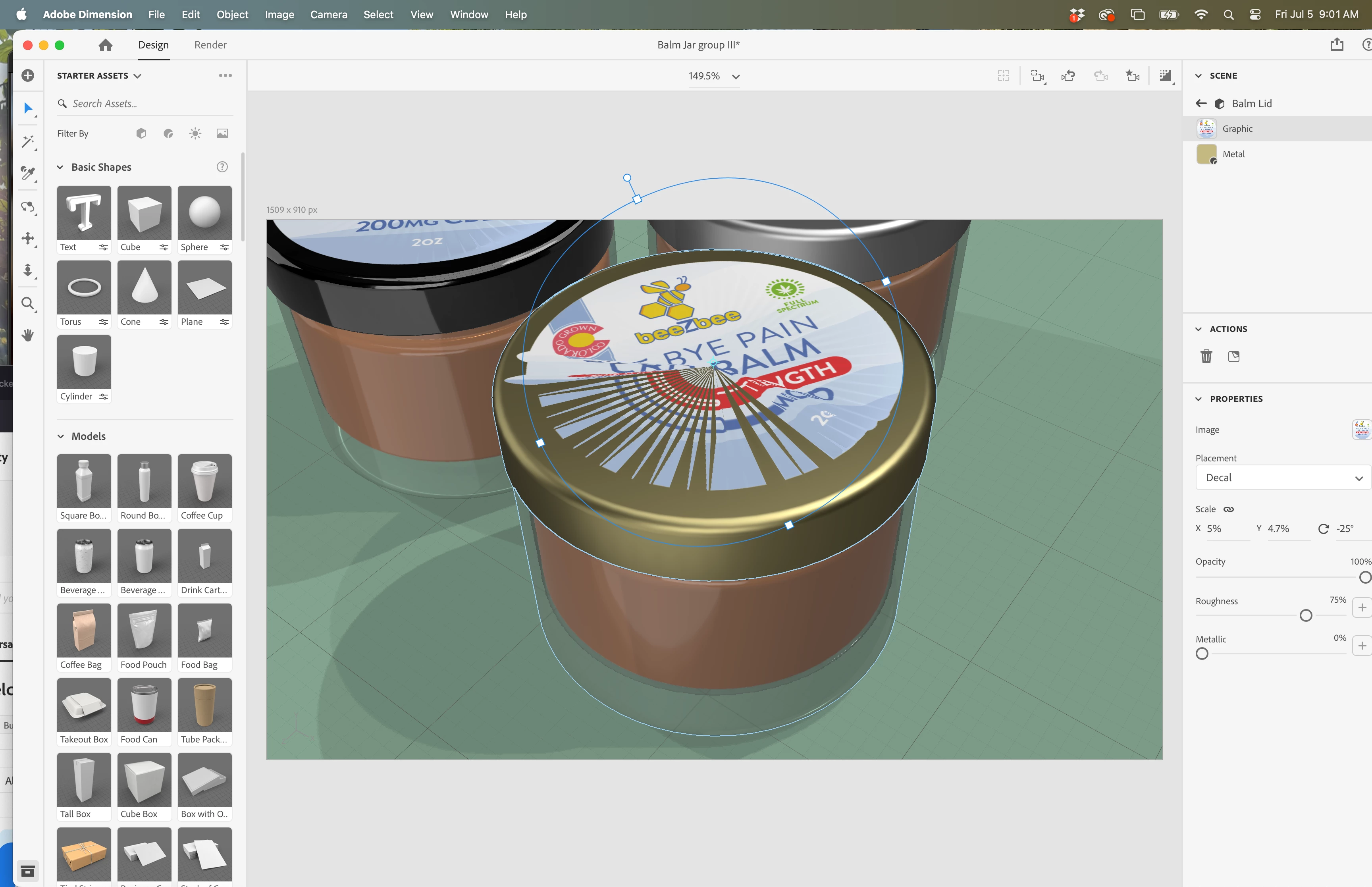 I'm constantly getting decal distortion when placing labels (ususally on flat/round objects) in Adobe Dimension. Would love a solution if anyone has one. See screenshots. Thanks!