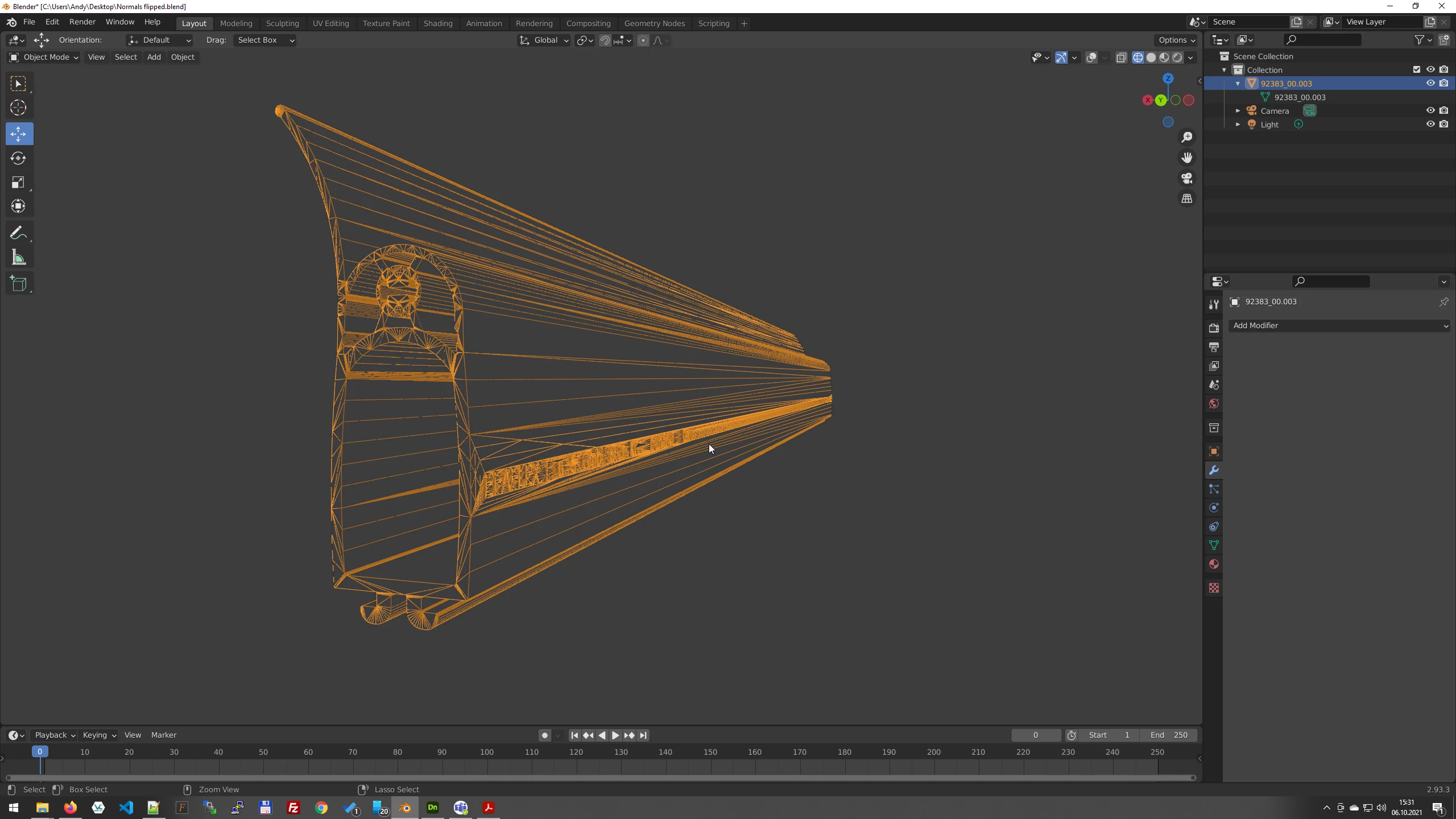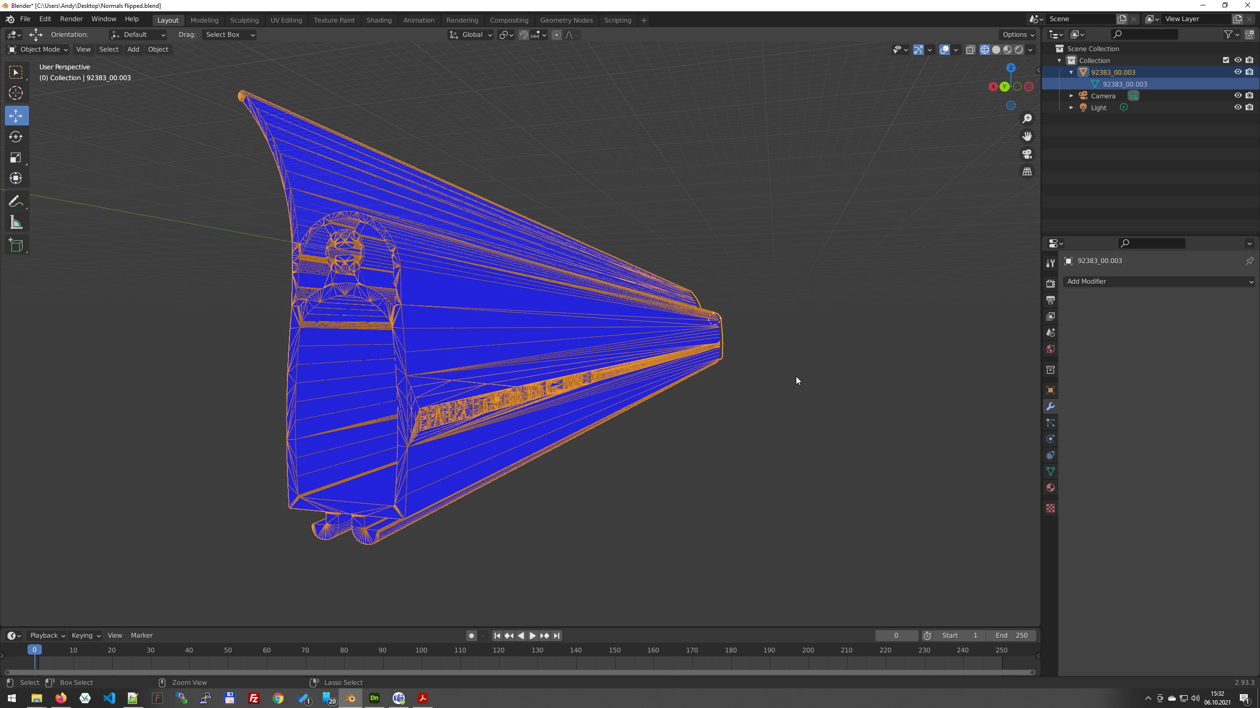 I imported it as .obj, generated uv's, chose the wand, put the decal on it and the decal is destorted. It's not the Normals, a you can see in Blender, seems like the Verticals are turned.