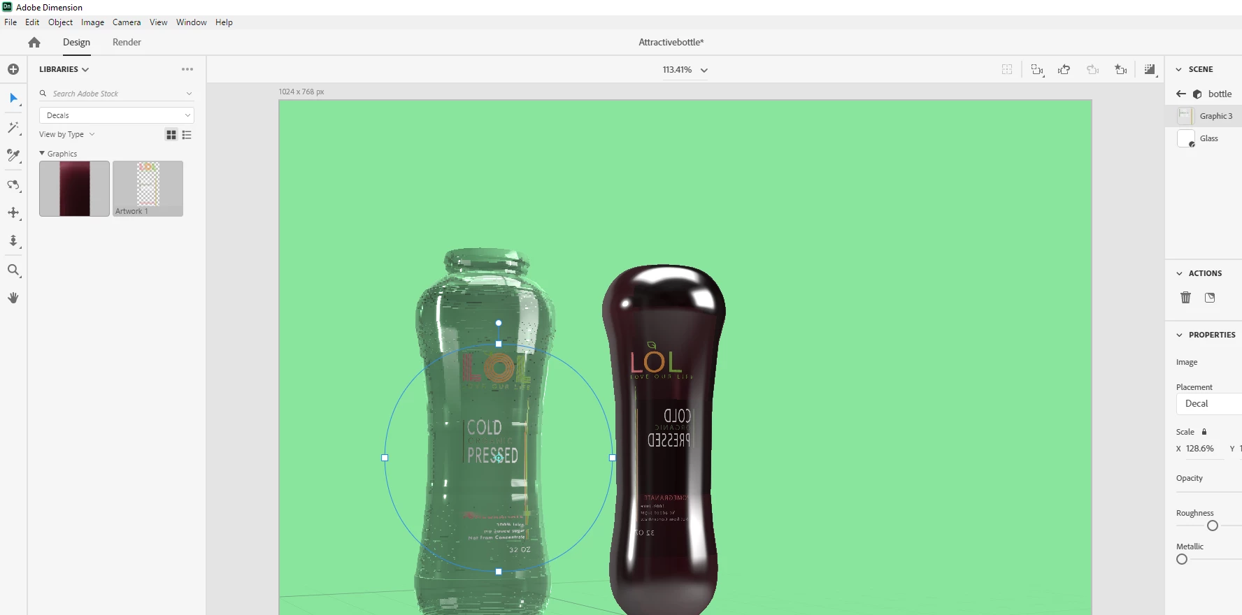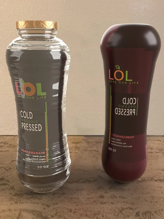 - I use Photoshop and you say you want the end result to look like that photo... I would build the bottle in Photoshop and put the decal dirrect on the glass but then you have to build a fill [assuming you want one] and you have to make sure your glass is smooth which i have not done in this example to show how a ruff glass distorts the labels