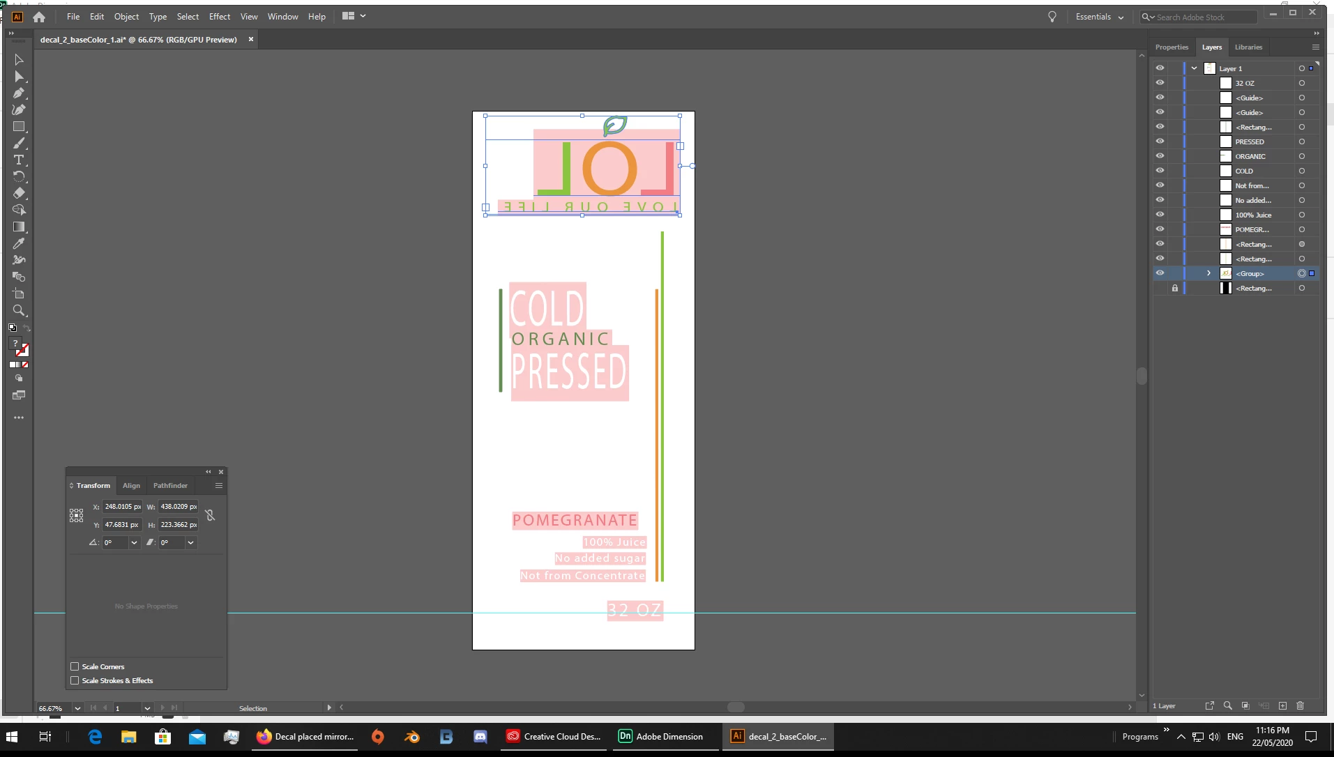 - your bottle is smooth [thats good] but you have an image as the colour [thats going to show up in the rendors] and your UV is back the front which makes the decal also rendor back the front... a simple enought fix is to flip the decal which i show