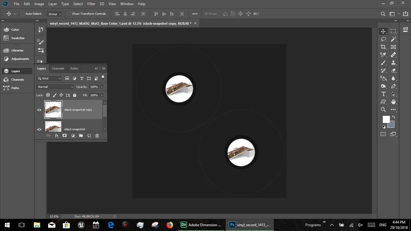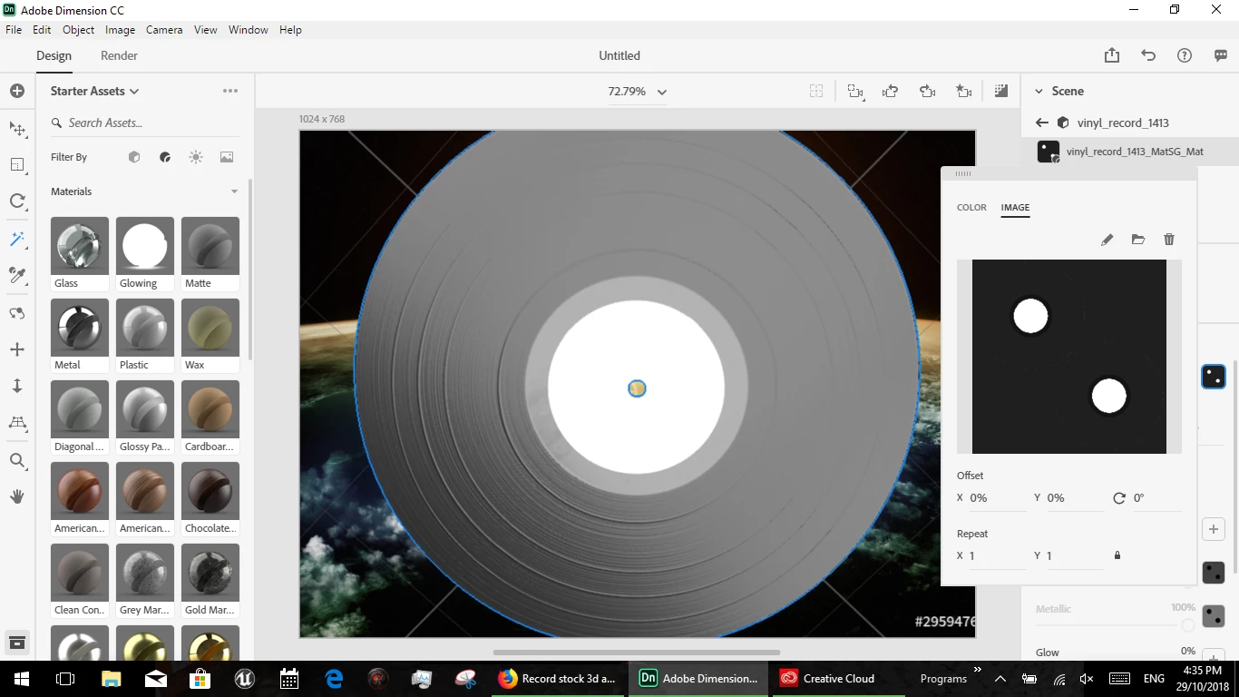 I've downloaded several of the vinyl record templates from the Adobe Stock site. I started placing graphics on the objects, but I'm having a lot of trouble getting the label part of the record to look right. I'm talking about the center of the record itself which is a circle with a small circle cut out of it. Any image I try to place here is heavily distorted, almost like it's being placed on some kind of distorted glass object. I just need the image to appear flat and with just the usual scaling. I can't figure out what I'm doing wrong or need to change.