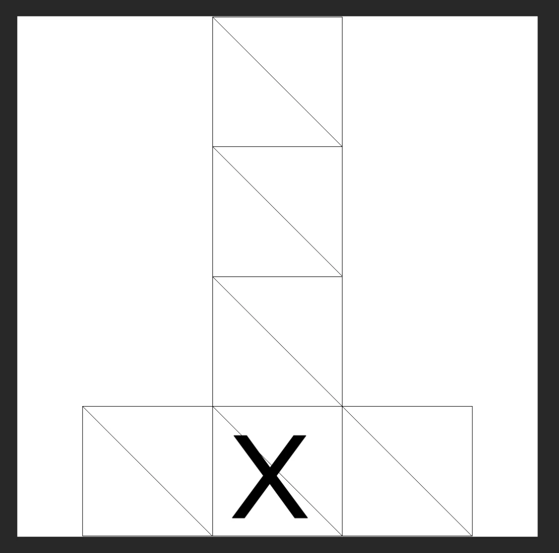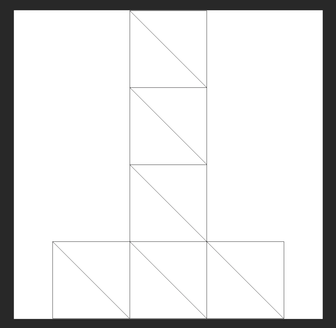 You can now use this guide as a template for laying out details on your model. In this case you want to create a black and white image where white = solid areas and black = cutout areas. For this cube I want it on the front panel which is at the bottom. It can take a little trial and error to figure out where things are. You can tab between this document and the 3D document to see the placement in 3D.