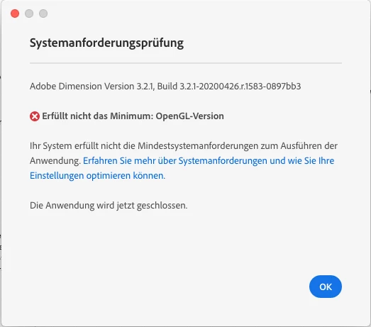 Hello, i have a macmini 2018 with an external GPU and Mojave 10.14.6. The e GPU is a Radeon RX Vega 56 8 GB. Is there a possible workaround to start Dimensions on my hardware? The open GL version seems to be too old. But how to update open GL? When try to start dimensions following error occurs: