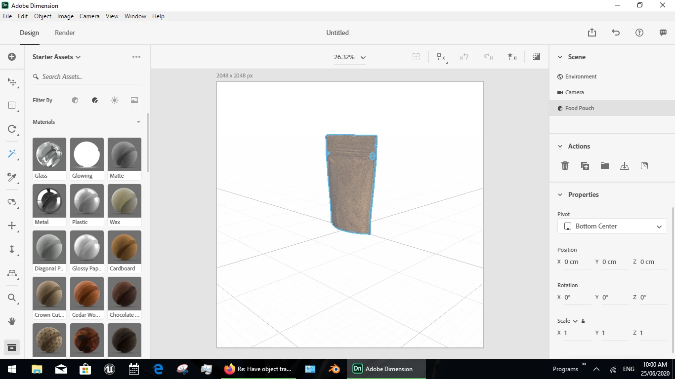 I've been using Dimension for a relatively short time, but I'm trying to render the food pouch that is provided by Adobe Dimension with one material on one side (paper/cardboard) and another one on the other (transparent plastic).