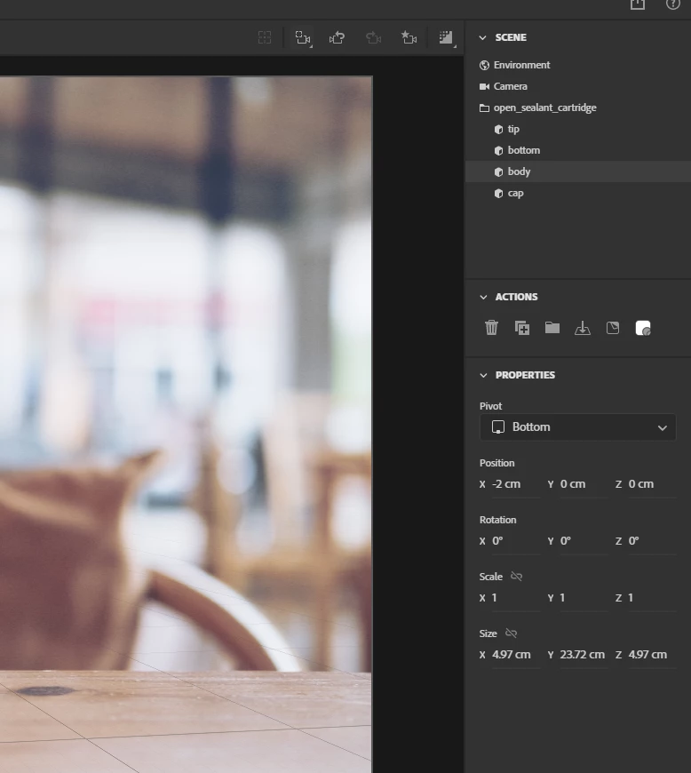 Double click on decal placed on object or expand Tip, Bottom, Body and Cap layers in scene by clicking on them. Then you can see decal layer. Select it and its properties will appear in property panel.