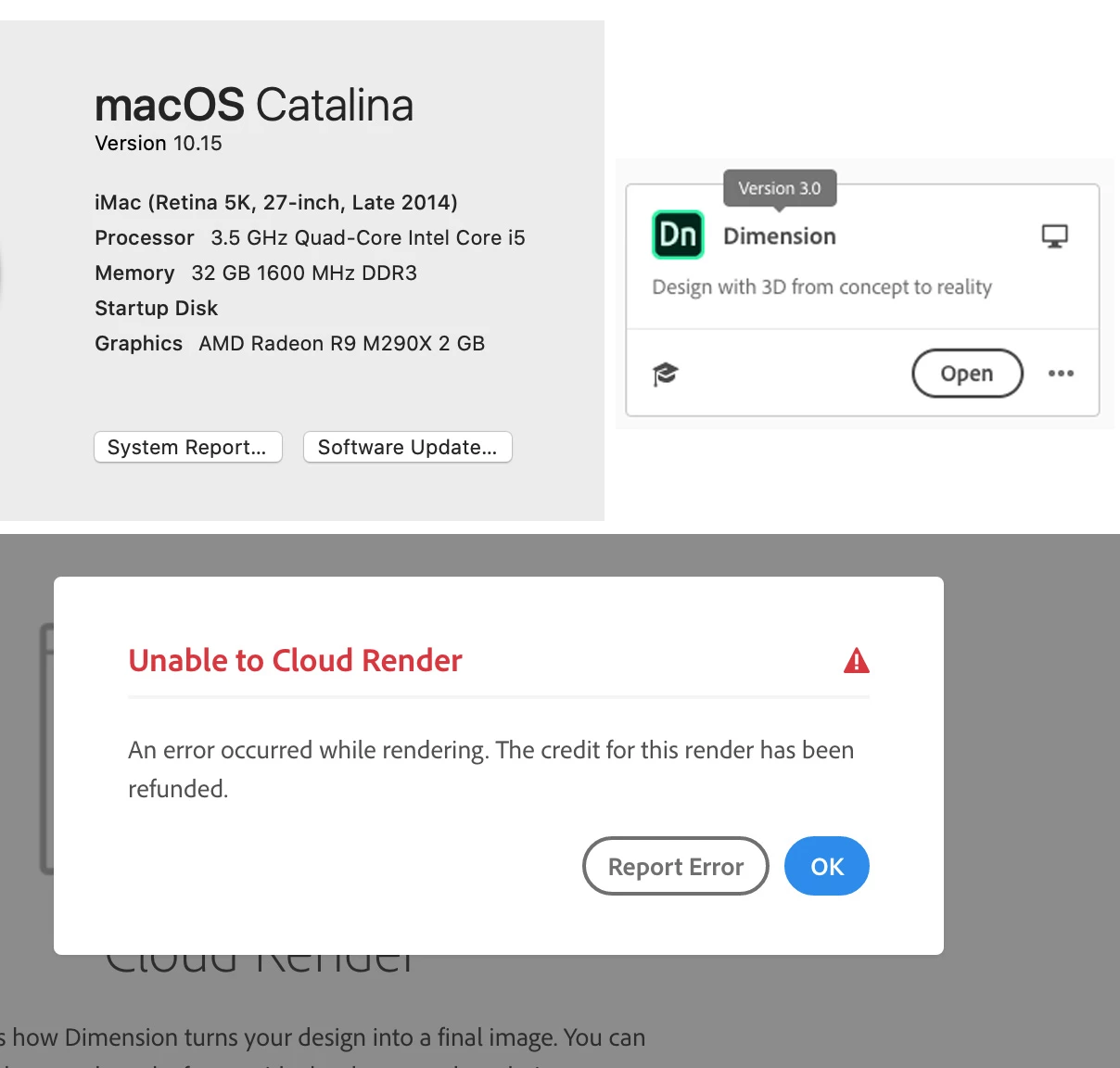Okay, so I have been trying to days to render this scene in various ways with various changes and boxes checked and unchecked and nothing is working. Here is a shot of my computer and the version of Dimension, along with the error that keeps popping up.