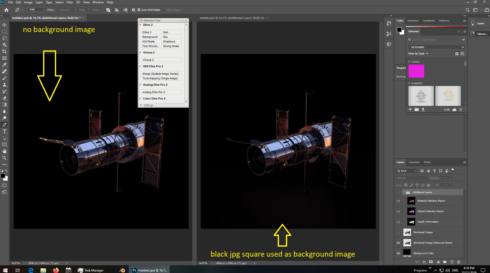 the left model has no background image and the right is the exact same with a black jpeg used as background... the light on the bottom is the ground plan which is understandable but the yellow back light on top of the hinge door should not be there
