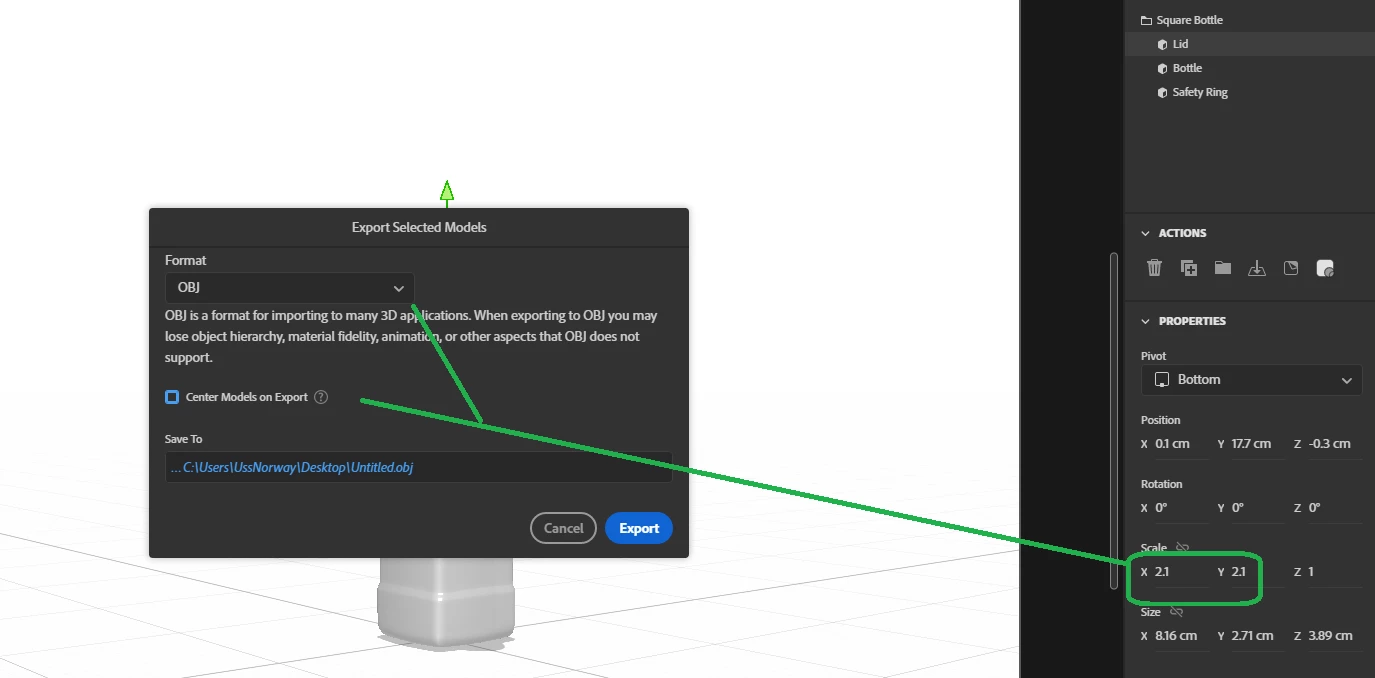 I received an .obj file from a co-worker of an object, but its native dimensions were too small. So, in Dimension I changed their Size XYZ to the dimensions that I needed and it looks good. However, the Scale is now not "1" for XYZ of the object, it is now Scale of "102.8" for XYZ (because I had to make it that much bigger!).