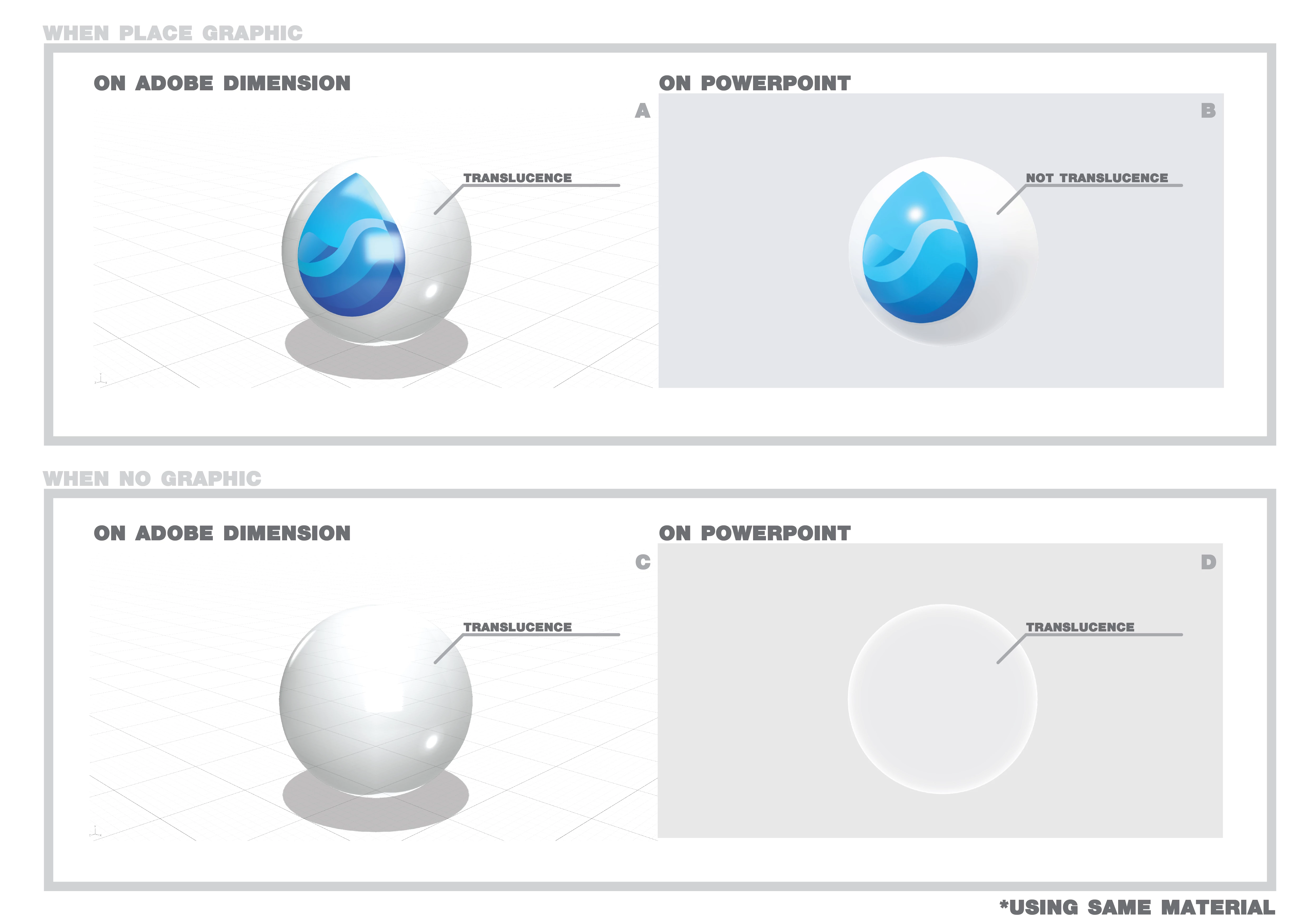 So I use .GLB format file from a program sent to Adobe Aero for making an AR and import to Power Point for making 3D presentation. I found some problem. When I place graphic on the translucence body like glass material. When it show on Aero and PowerPoint the transparency is disappear, But the glass body that not place a graphic still translucence.