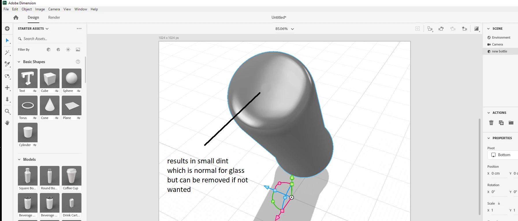 tip, Photoshop [unlike Blender] is a image tool so zero extrustion = a thin edge on your glass bottle that can be seen in Dimension... ime a 0.1 extrustion gives much better results but I include both in my example files