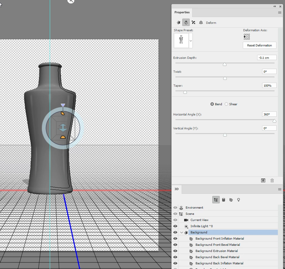 You can easily make a round bottle in Photoshop from a circular extrusion - just draw half of it with the pen tool. Don't forget to draw the path as the inside and outside of the glass area - a bottle is hollow not a solid lump of glass. When extruding I find setting depth to 0 (which actually gives a tiny value of -0.1) is the best you can do. Apply the glass material to all the extrusion surfaces or you will get a visible join at 0 degrees and 360 degrees