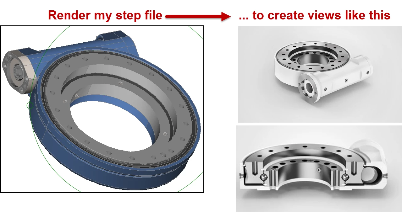 I need to create a 3D render as shown in the attached screenshot. My model is from a CADCAM system, and in .step format.