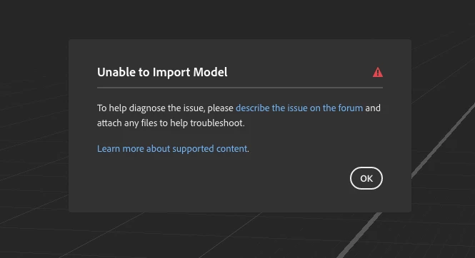May be the reason is that Adobe Dimension can open 3D models with polygonal meshes. It supports various 3D model formats such as .OBJ, .FBX, .STL, .SKP, .GLTF, .GLB, and .USD1. However, it’s important to note that Dimension only supports polygon geometry, so non-polygonal models like NURBs and curves cannot be imported1.