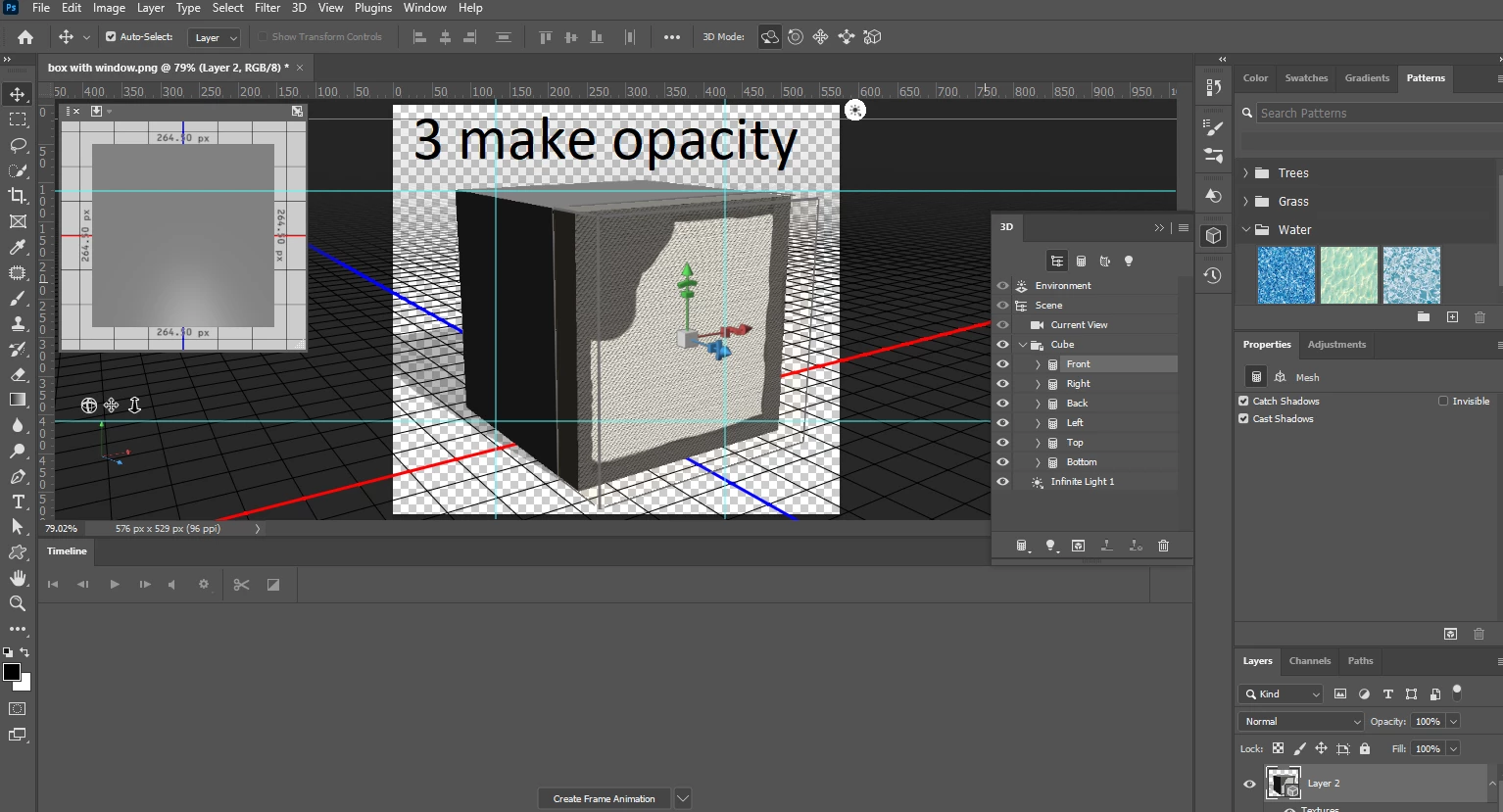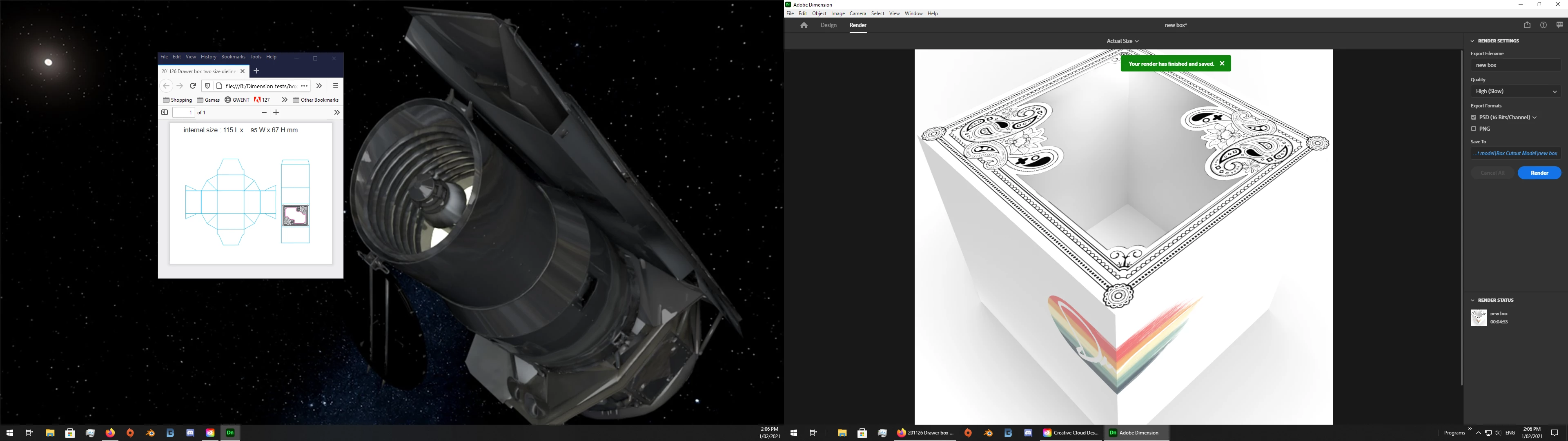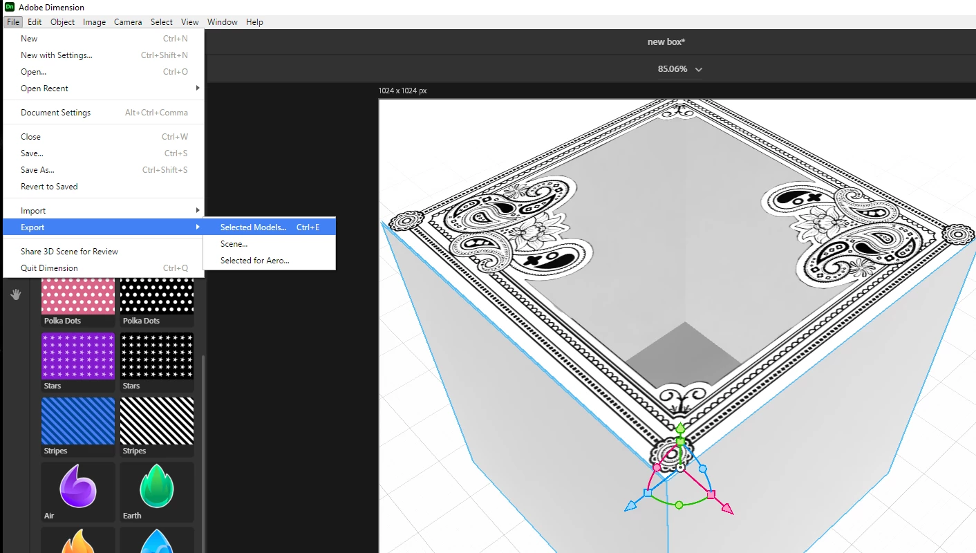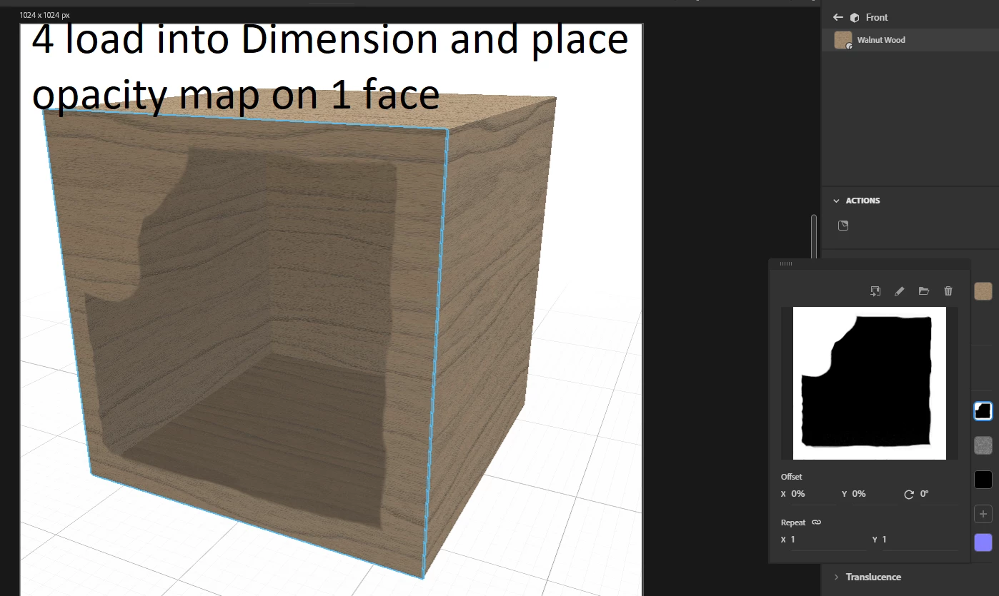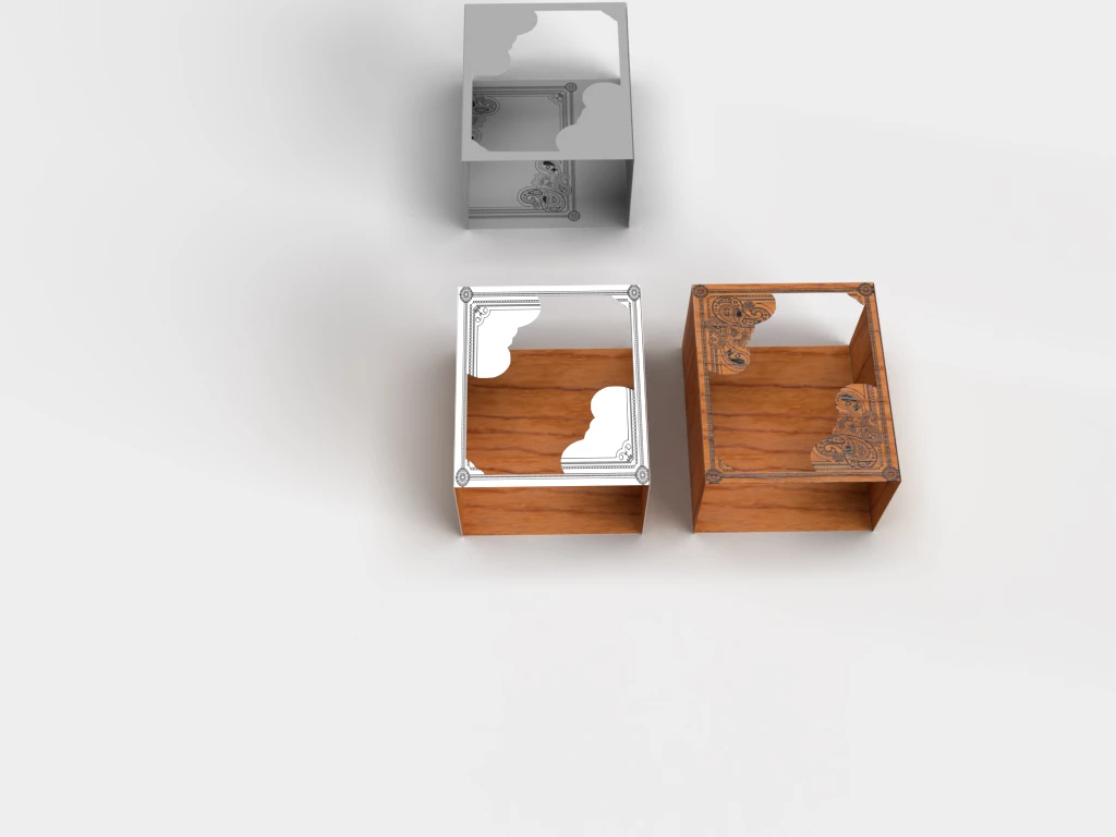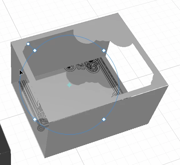 I've got a model of box that has a laser cut window on top of the box. I want to overlay a graphic on top of the box, but I'm not able to make it work. The graphic is just being applied to the inside bottom of the model since there's a big hole in the top of the box.