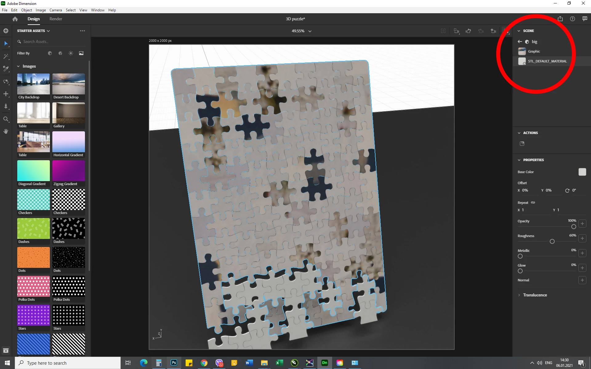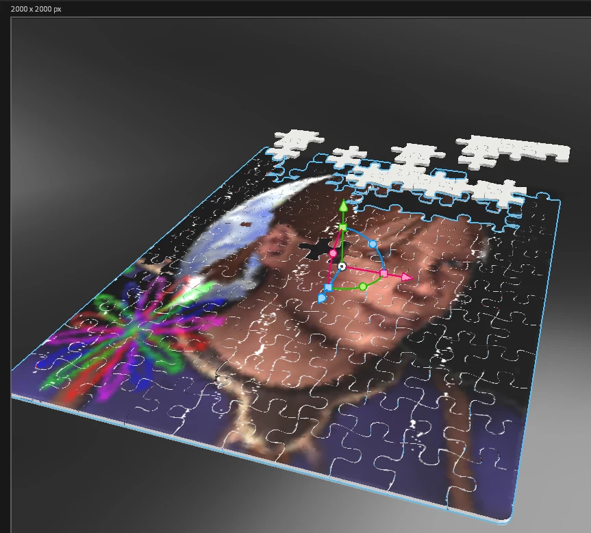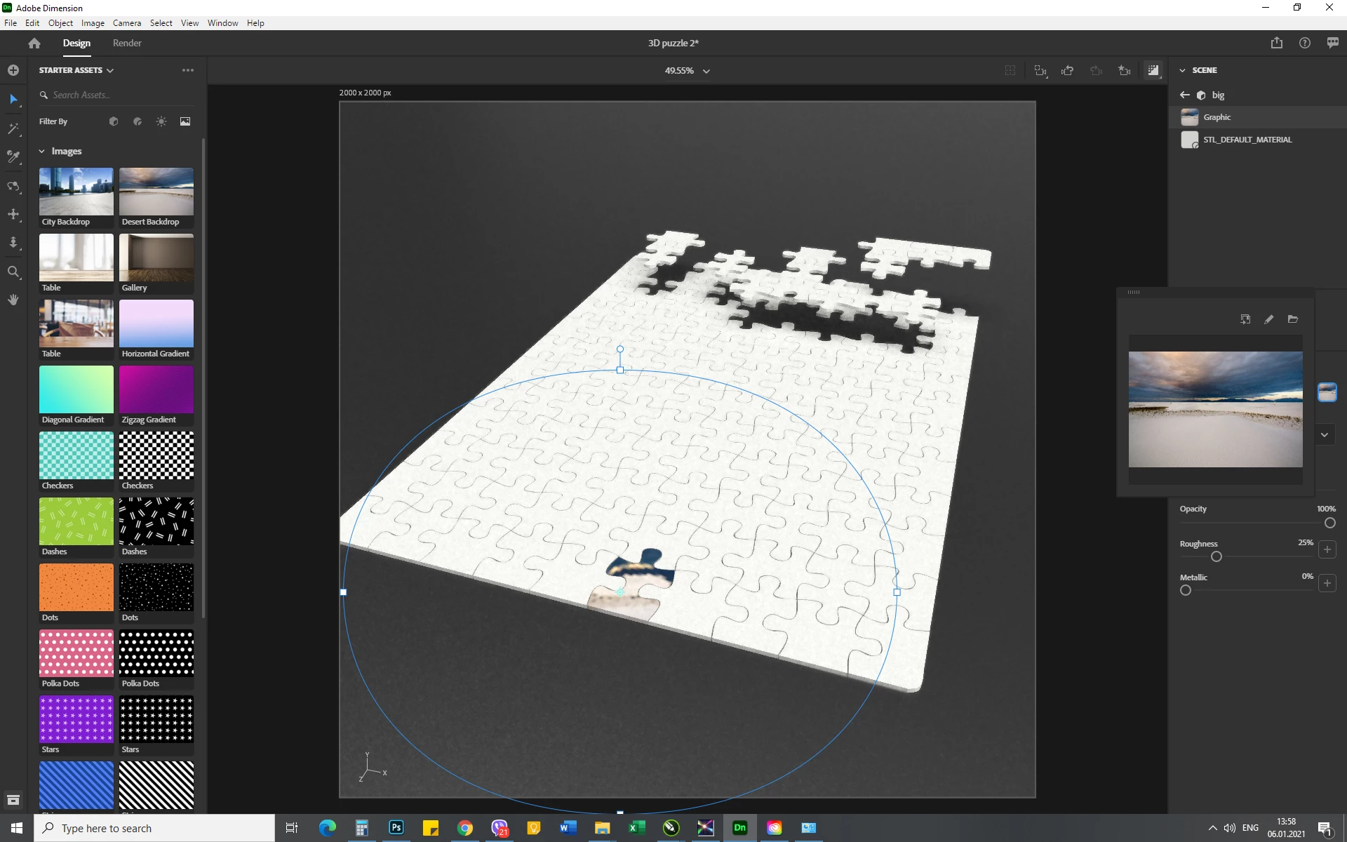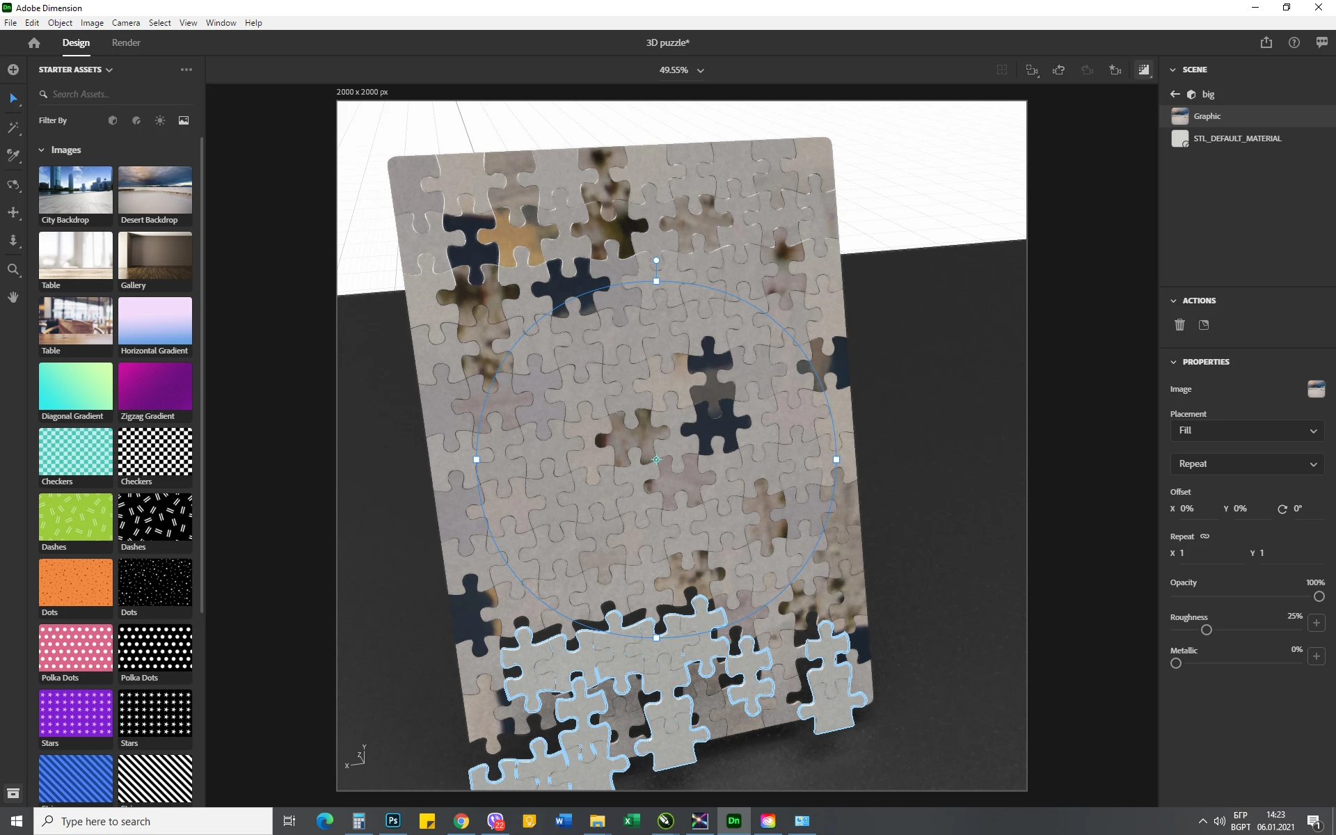 I would like to put a picture of a 3D puzzle in Adobe Dimension, but the picture is placed only on one of the pieces. When I move a photo, it is positioned in only one of the pieces, not to all pieces. It would be good if the program has an option "fit to object" or "powerclip - place inside frame"...