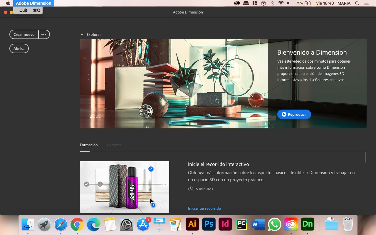 Tengo problemas con este programa, es la primera vez en mi vida que lo descargué y cuando lo abro, aparece esto pero no puedo darle click cualquier cosa, parece como si fuera una imagen o algi así. Tambien ven la parte superior donde el puntero está en la pestaña de "adobe dimension" al lado de la manzana, solo me aparece la opcion de "Quit".