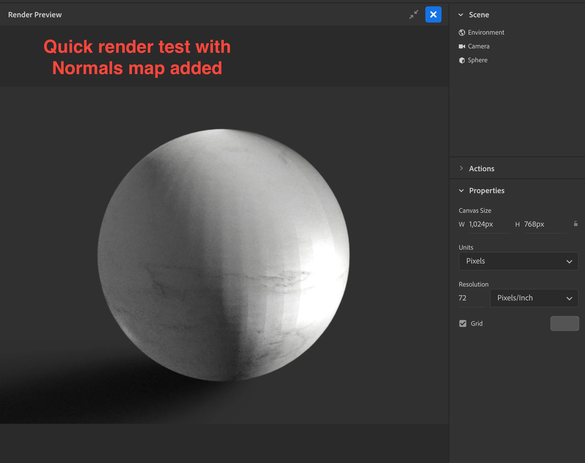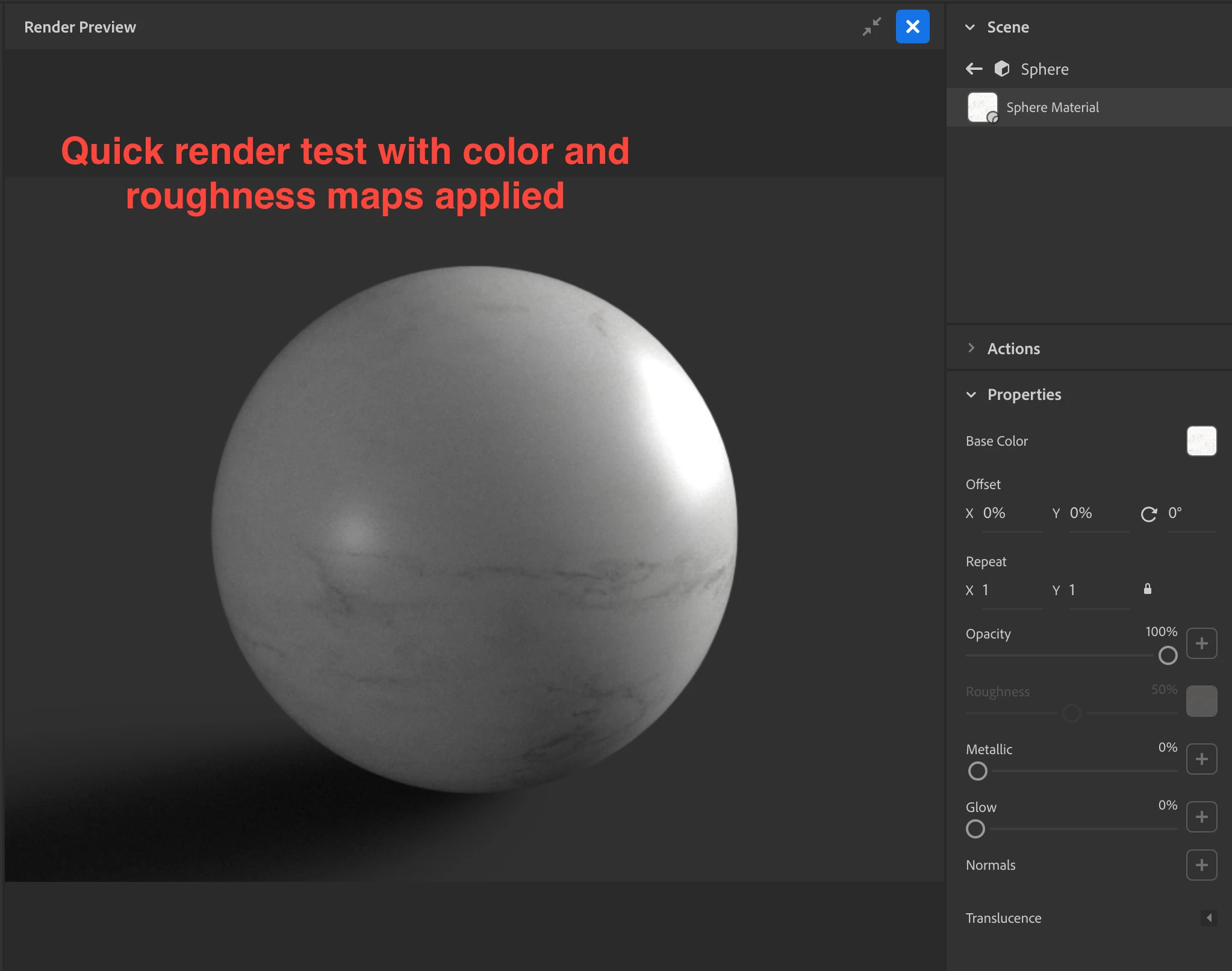 I'm having issues when I apply a Normals map. I created a seamless marble texture in photoshop that's 2048x2048, which I used for my color map. Then I applied a roughness map which was made using the newly created color map, adjusted in photoshop. Finally I generated a normals map. All in photoshop, all 2048x2048 jpgs. When I apply the color and roughness map to a default object from Dimension, I get good render results, but once I add the Normals map, I get a strange tile-like patchwork on the surface. This is more prominent in other models with more geometry. For this test, I used a default sphere model from Dimension. I did not attempt to Generate UVs under the Object menu, that actually makes the effect worse when I do, and my render engine is set to V-Ray. What am I doing wrong? (See screenshots below)
