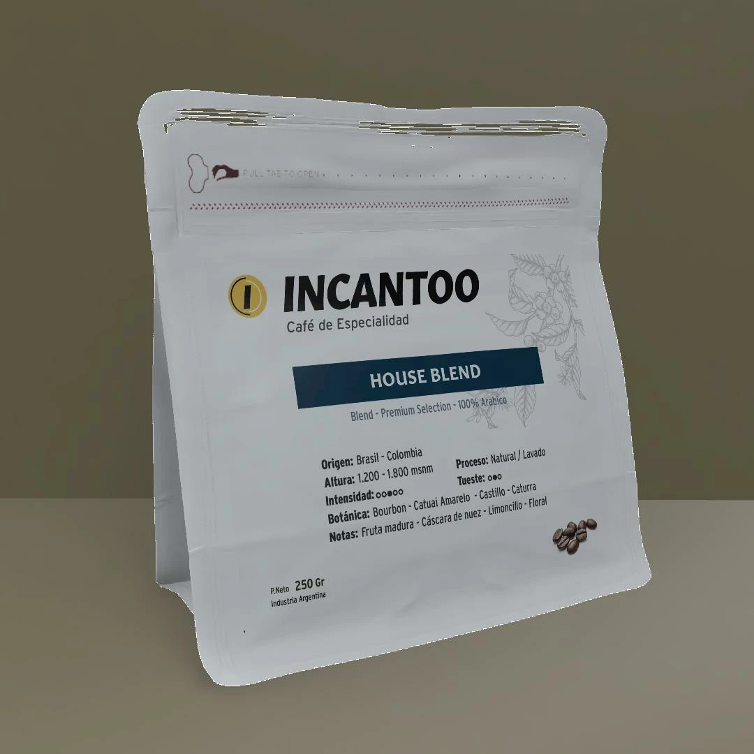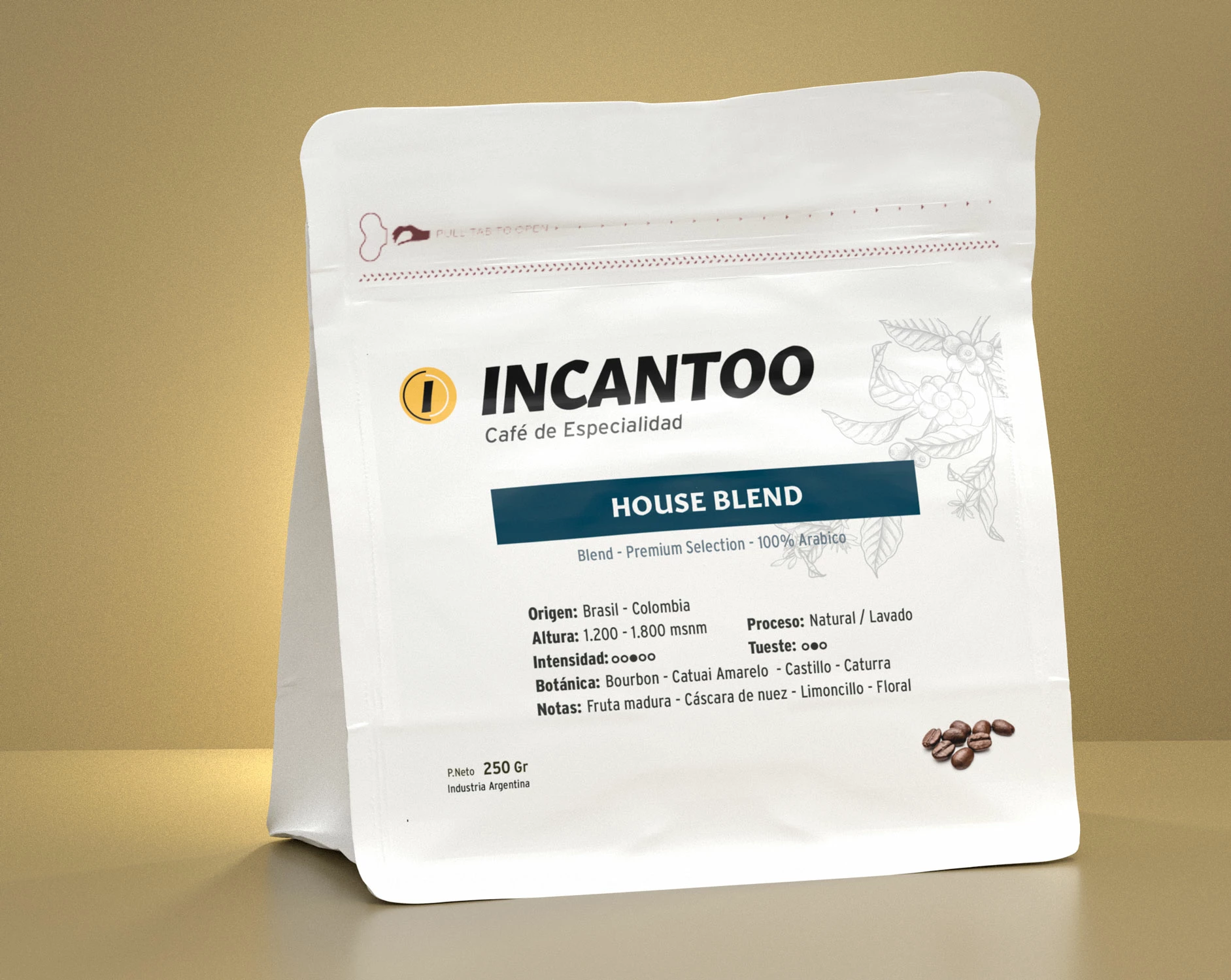 Tengo un objeto que es una bolsa de café con una etiqueta y con una pared detrás que tienen 2 esferas con glow que irradian luz.