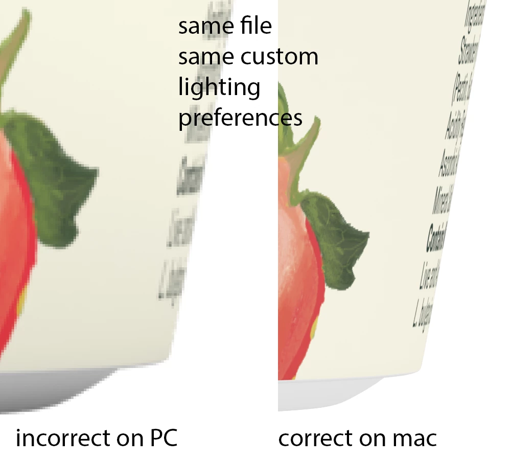 I have a custom environment lighting effect in my Adobe Dimension file. The image is of a cup. When I save the file and then move to a PC environment, the lighting at the bottom of the object changes and adds a shadow to the lower part of the cup. Not the base shadow, but a blended shadow at the bottom on the cup which is not present in Mac view.