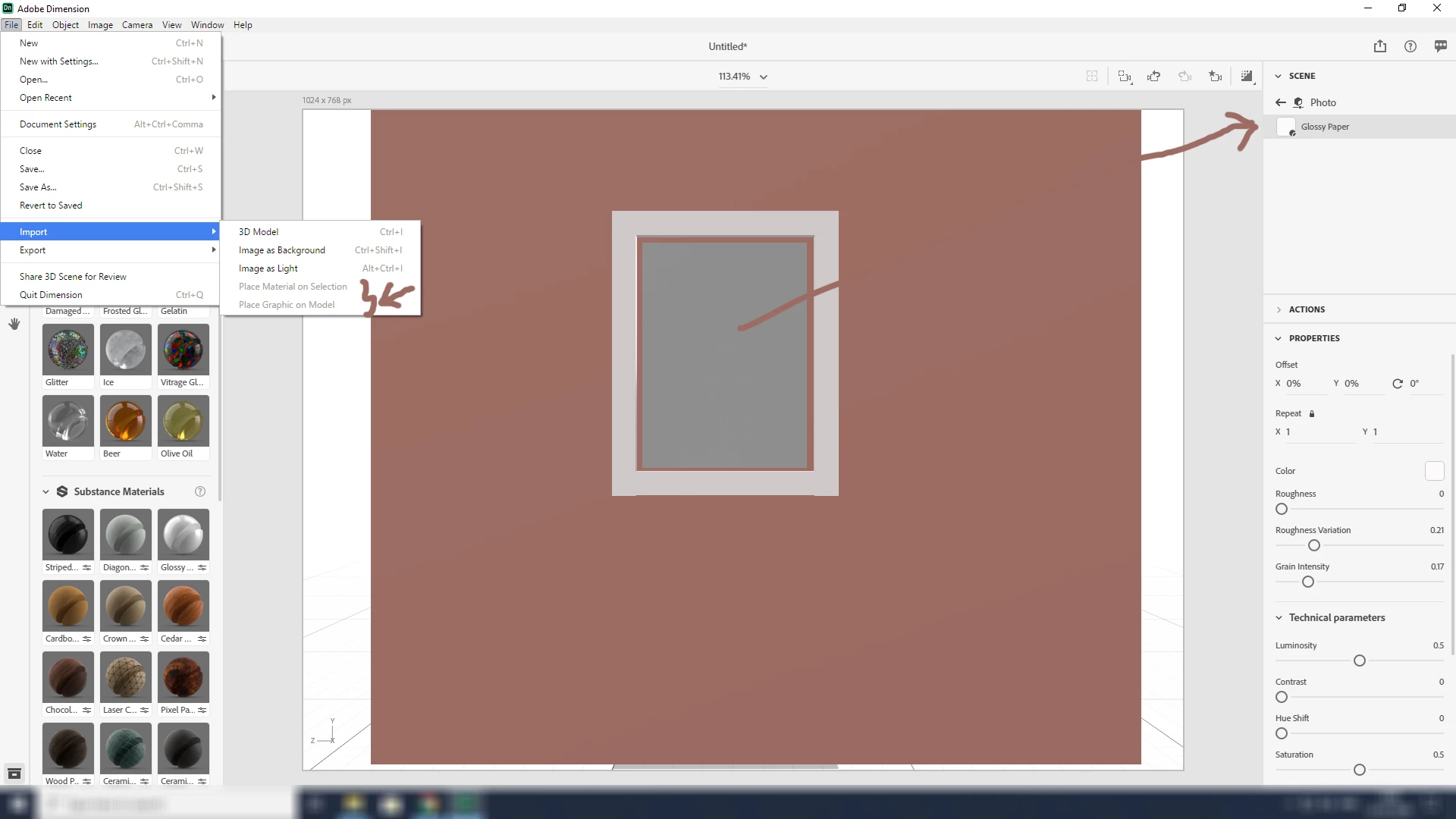 When I reach the step to import graphics on the model to my cube, I get the option "Place Graphics on Model" as greyed out. I tried every possible way to place a picture on my cube but never work. Help me become an Adobe Dimension Scientist.
