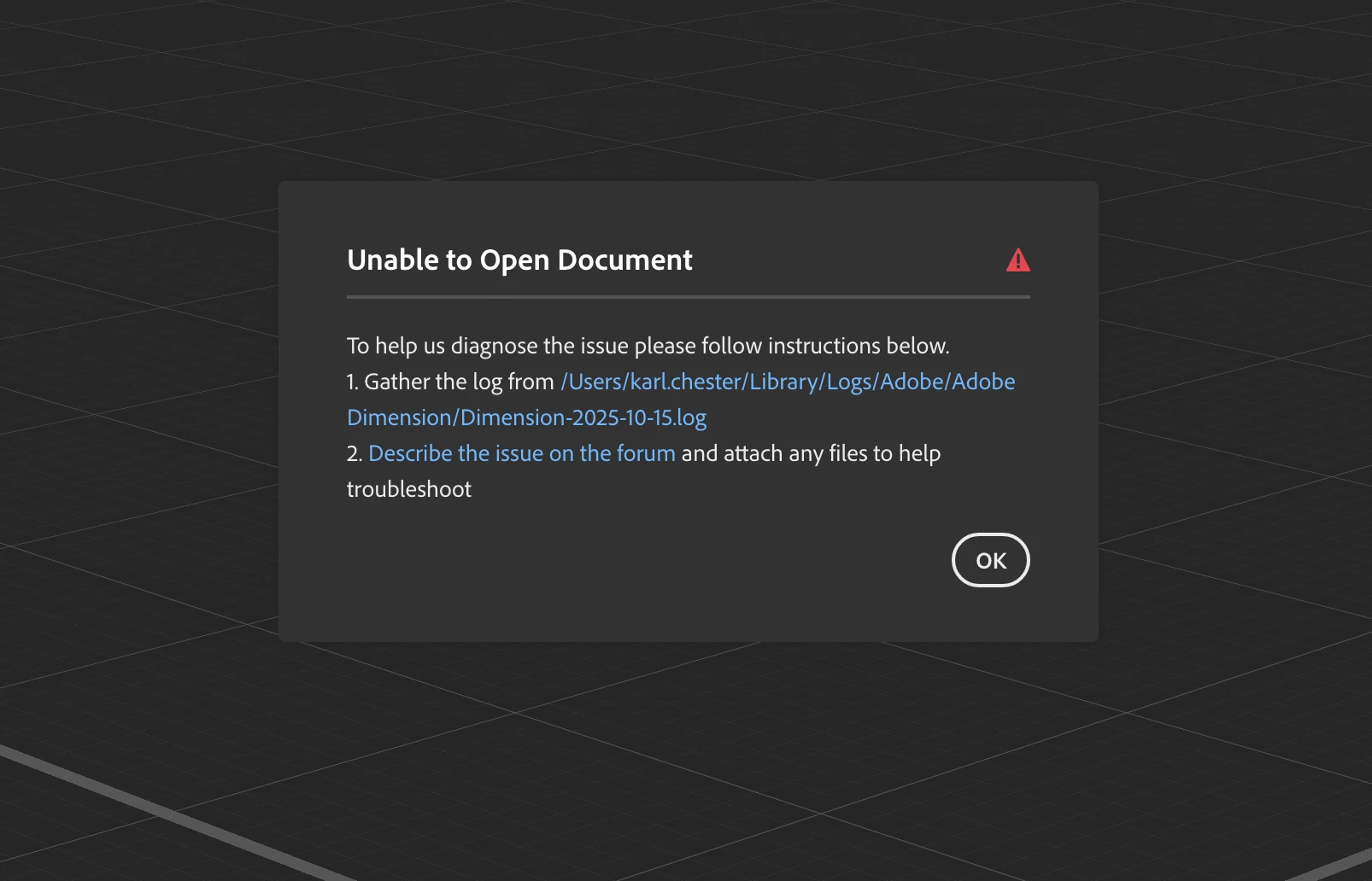 I get the attached message every time I try to open my dimension file. I need this resolved asap since my deadline for this end of day.